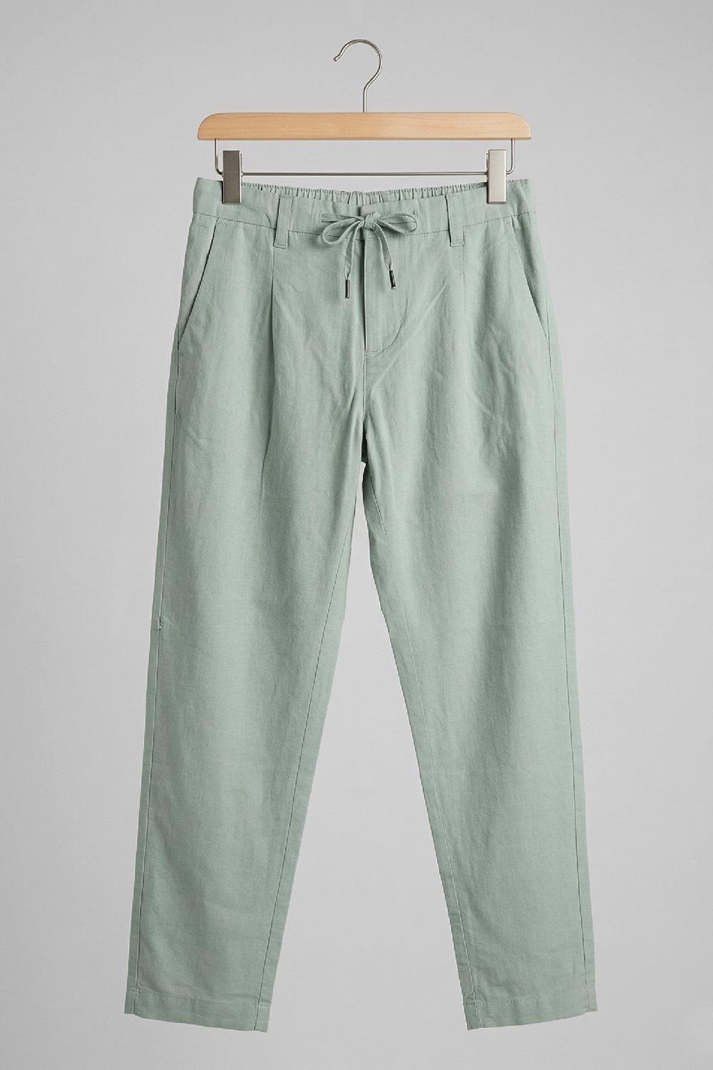 Pantalón chino de color verde agua en lino y algodón. De corte relax, tiene pinzas y cintura elástica con cordones de ajuste.