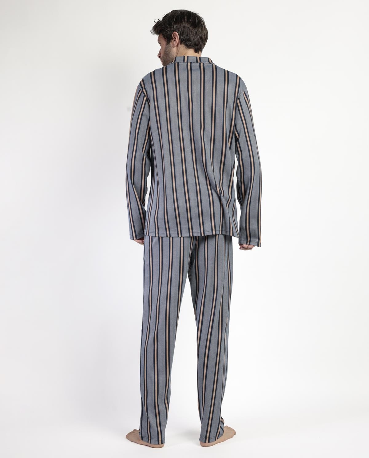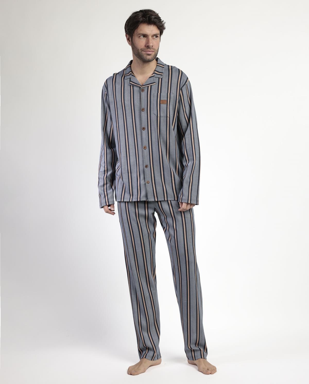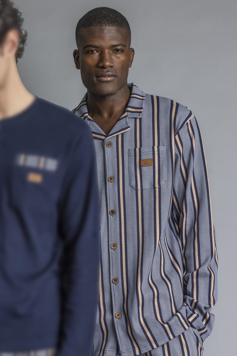Pijama abierto de punto de algodón, de manga larga, con cuello de solapa y pantalón largo. La parte superior está confeccionada en punto interlock de color marino, con bolsillo en el pecho y diseño personalizado de la marca Antonio Miro. El pantalón, también en punto interlock, cuenta con cinturilla elástica con cordón ajustable y bolsillos laterales. Su tejido es suave y agradable al tacto, proporcionando una sensación de confort en todo momento.