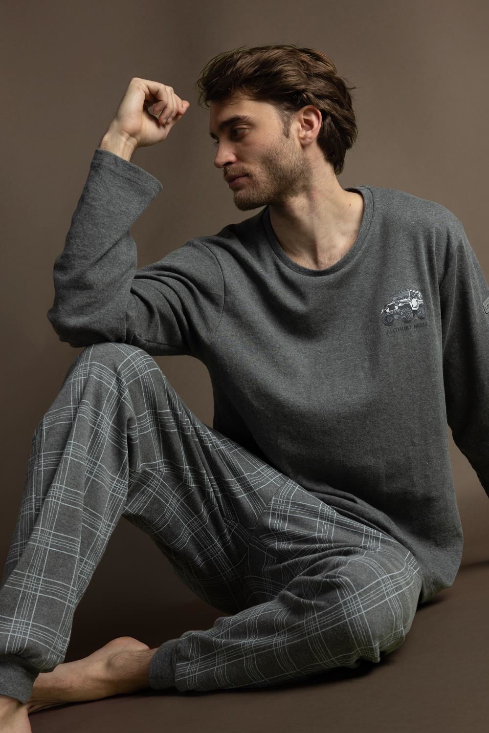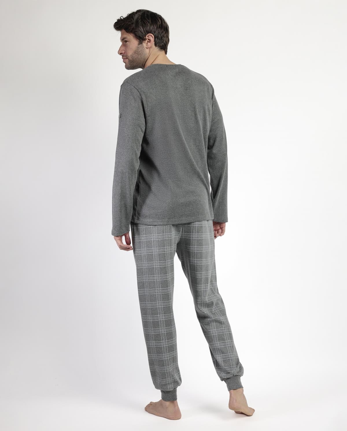 Pijama de punto de algodón vigoré, de manga larga, con cuello redondo y pantalón largo. La camiseta está confeccionada en punto interlock de color gris jaspe, con estampado de cuadros y diseño personalizado de la marca Antonio Miro. El pantalón, también en punto interlock, incorpora cinturilla elástica con cordón ajustable, bolsillos laterales y puños. Su tejido es suave y agradable al tacto, proporcionando una sensación de confort en todo momento.