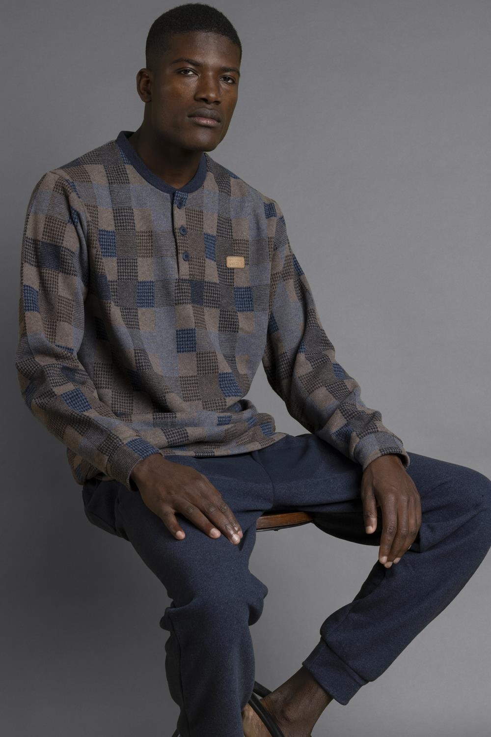 Pijama de punto milano vigoré, de manga larga, con cuello con tapeta de botones y pantalón largo. La camiseta está confeccionada en punto milano calentito, en color marrón, con estampado de cuadros y diseño personalizado de la marca Antonio Miro. El pantalón, también en punto milano calentito, cuenta con cinturilla elástica, bolsillos laterales y puños. Su tejido es suave y agradable al tacto, proporcionando una sensación de confort en todo momento.