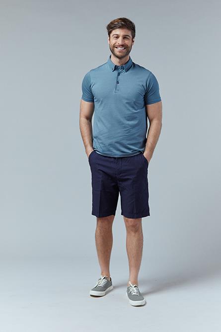 Polo liso de manga corta en algodón, con frontal en jacquard, botones en el cuello y aberturas laterales. De corte regular está disponible en negro y turquesa.