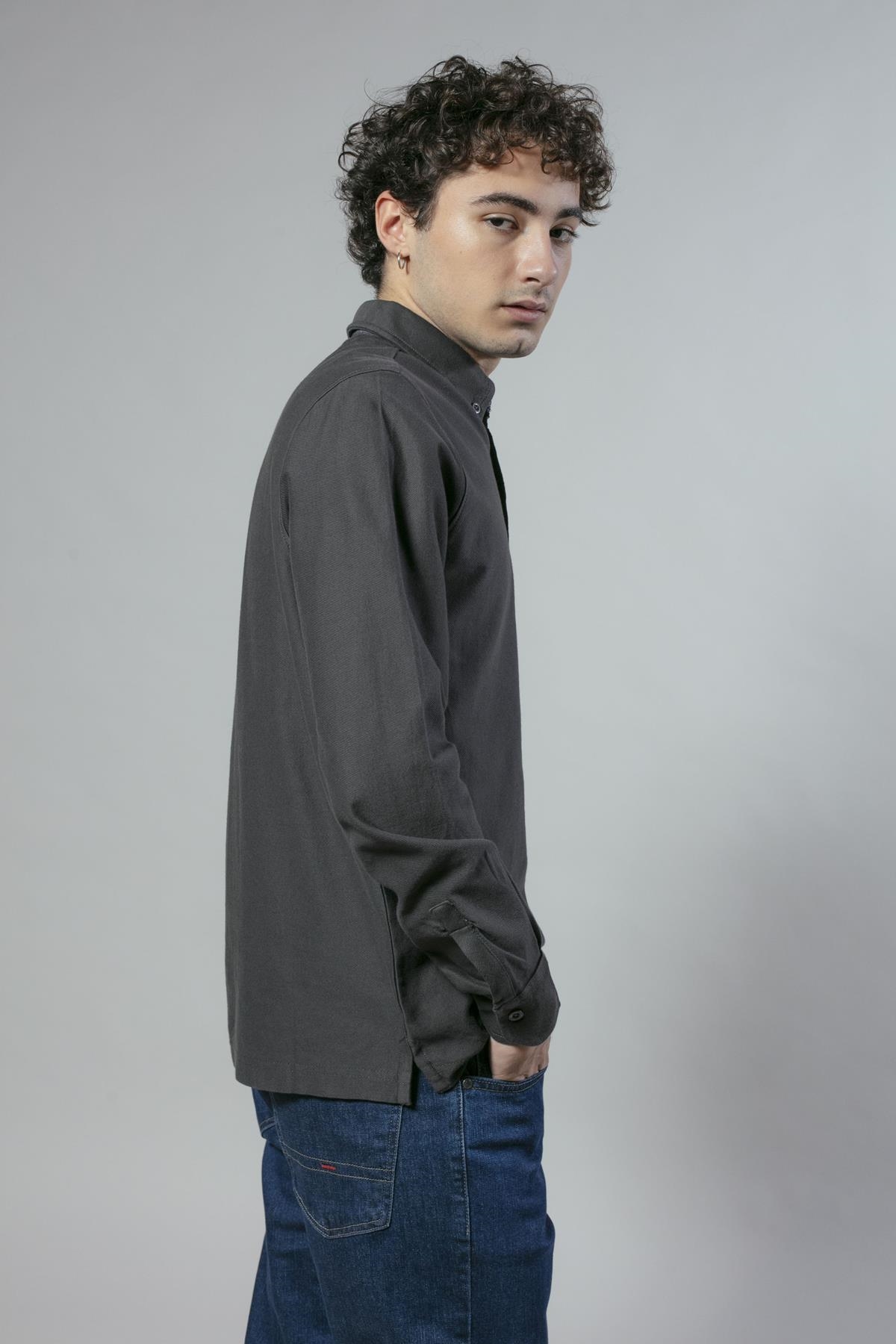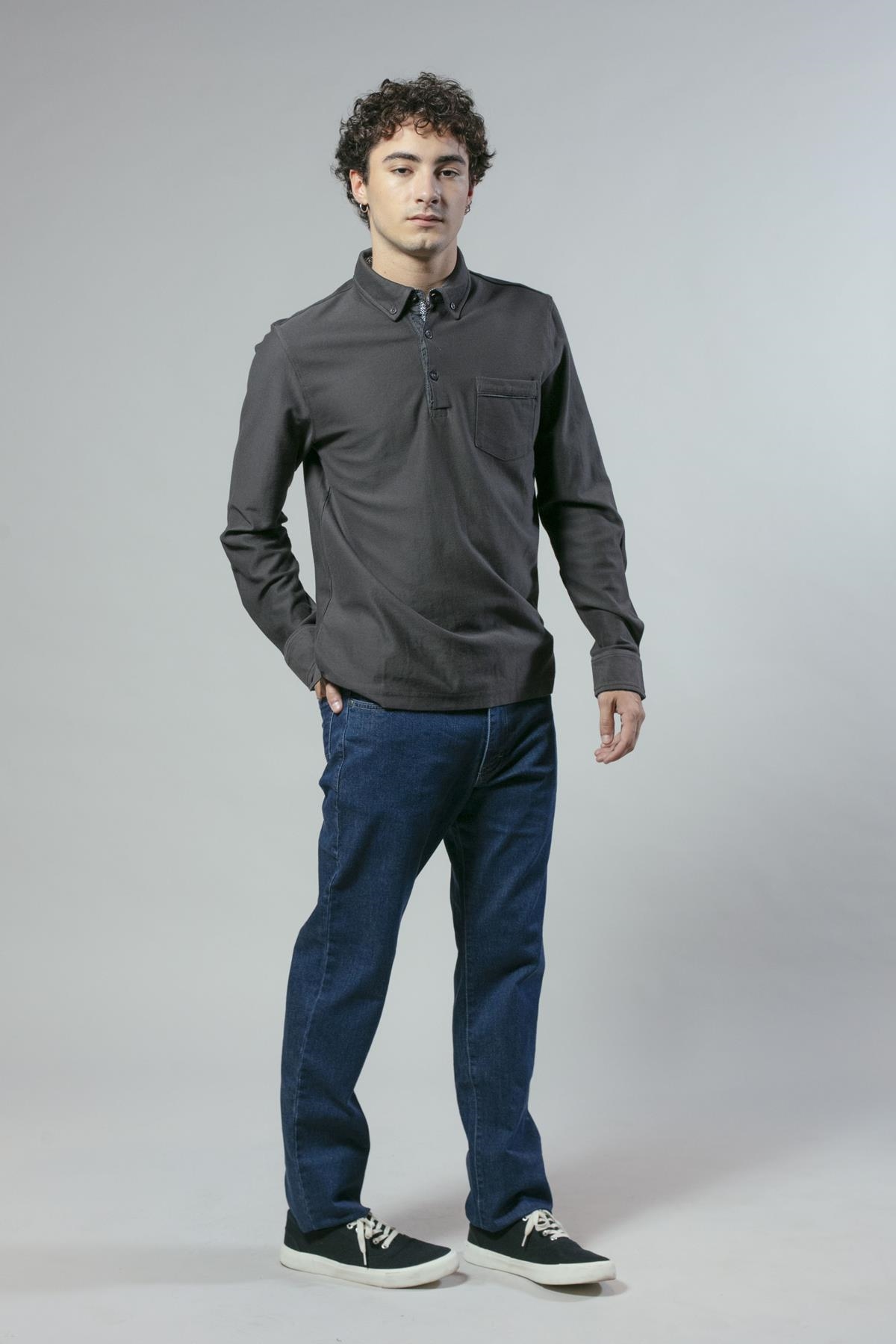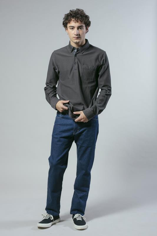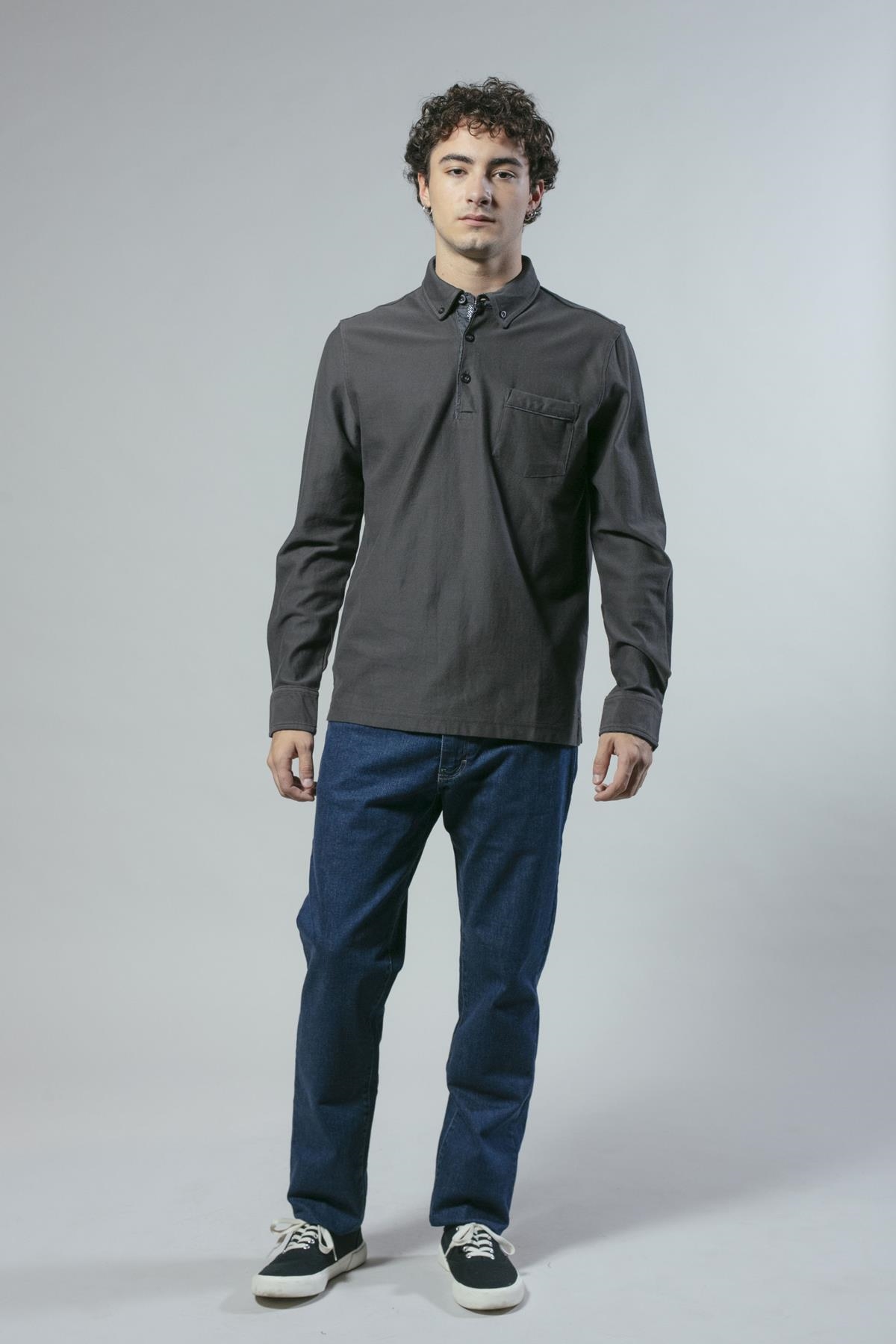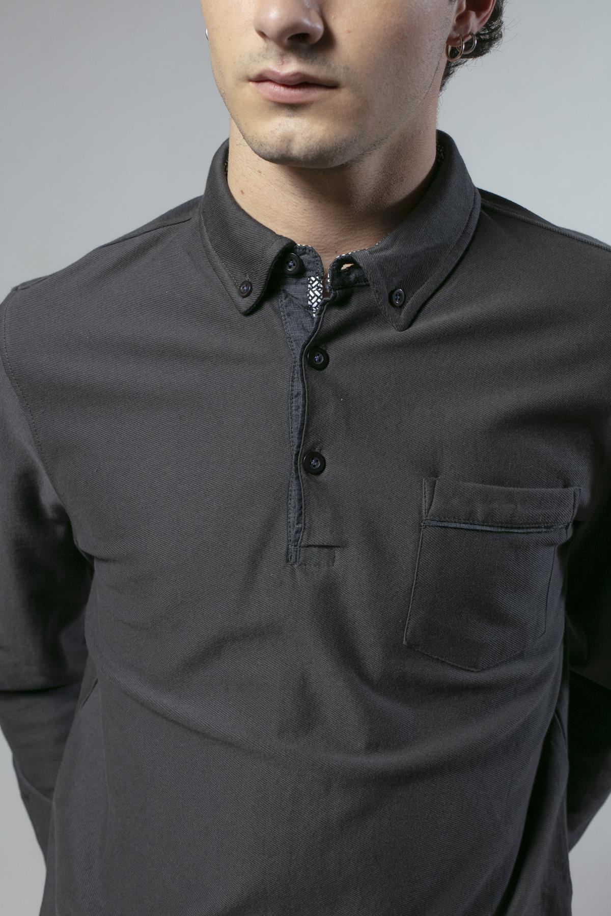 Polo gris de manga larga en estructura de algodón, con detalles en contraste, bolsillo frontal y de corte regular.