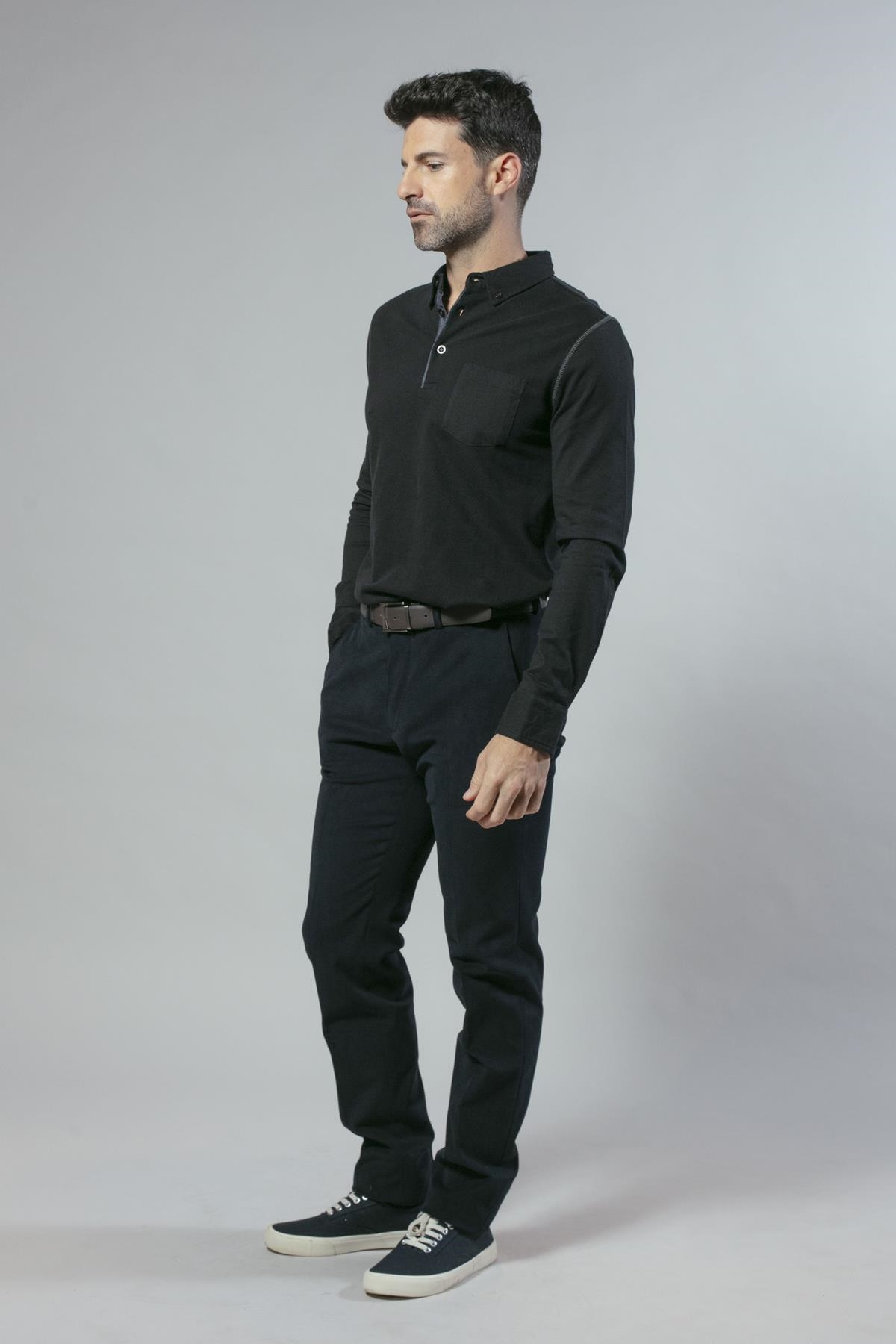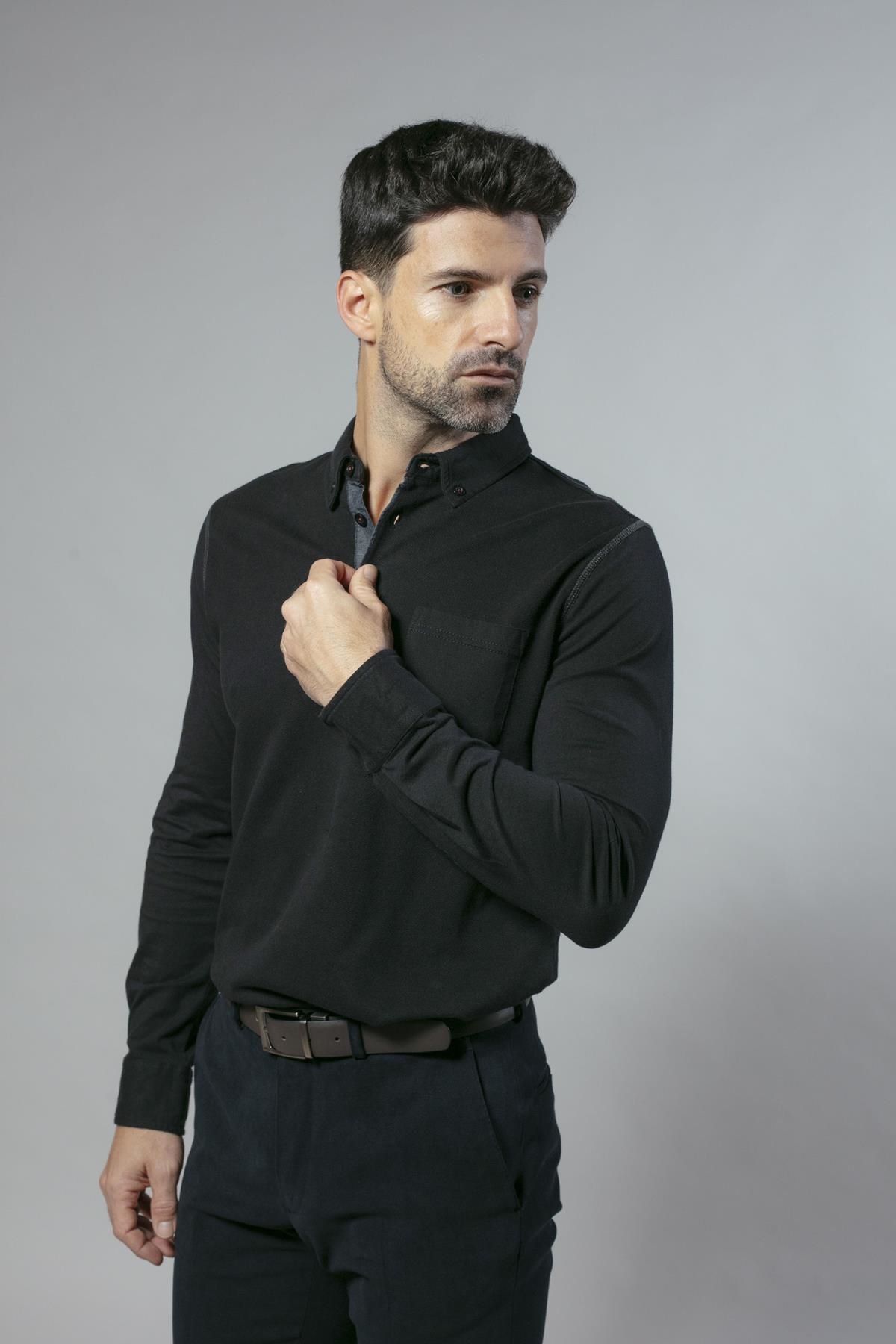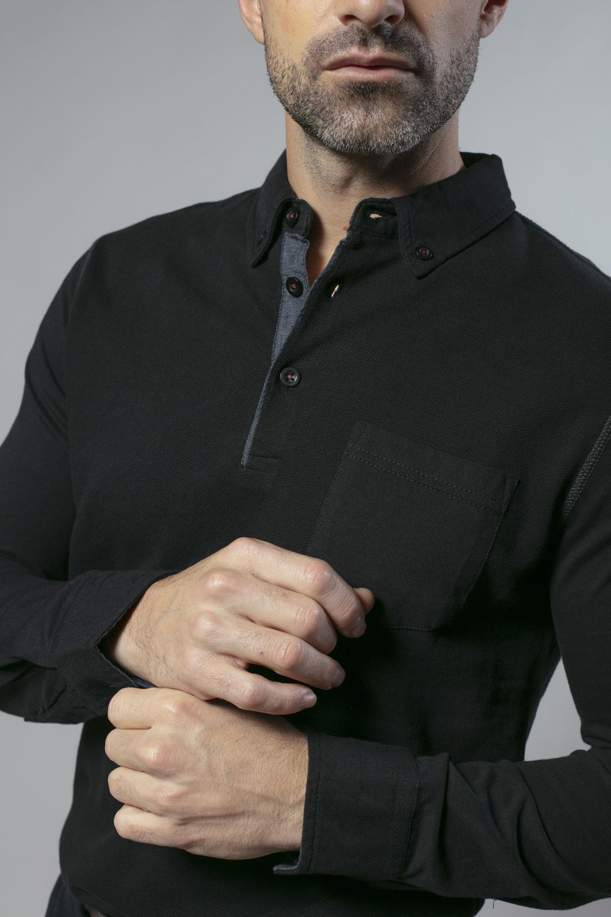 Polo de manga larga con frontal en estructura de algodón. Es de corte regular, con botones en el cuello y un bolsillo. Disponible en dos colores: negro y azul marino.