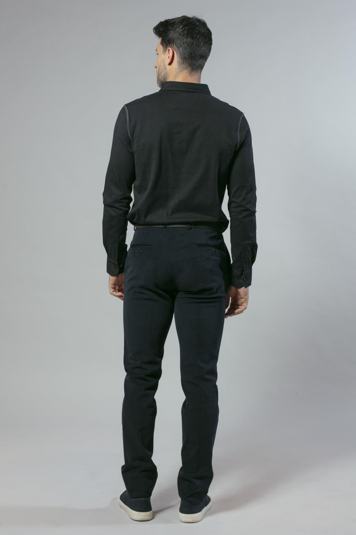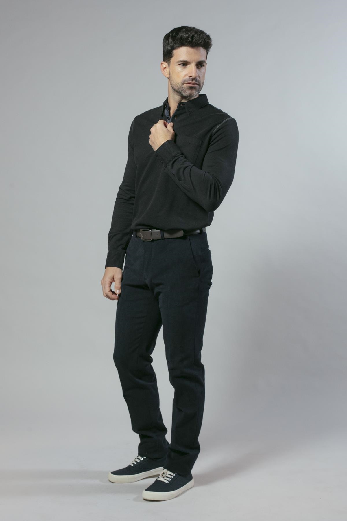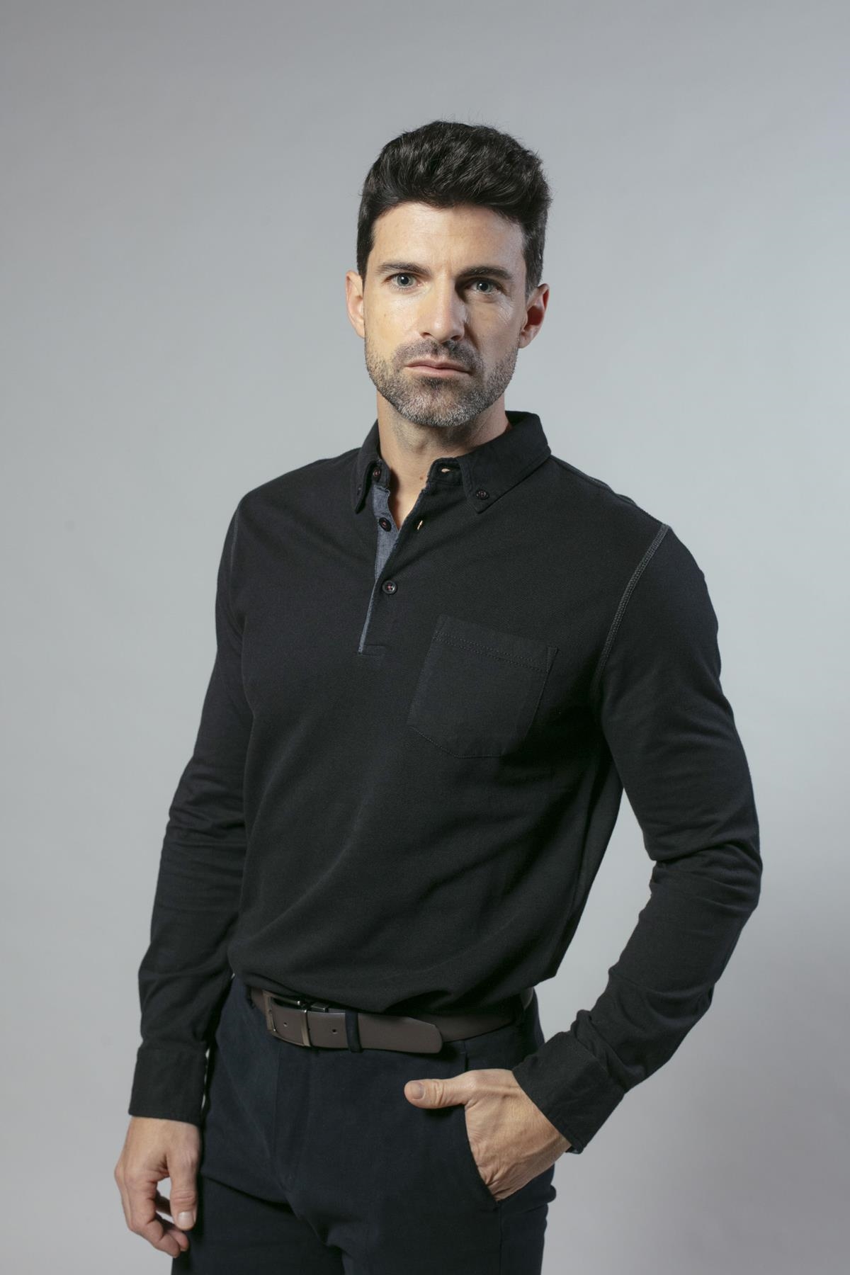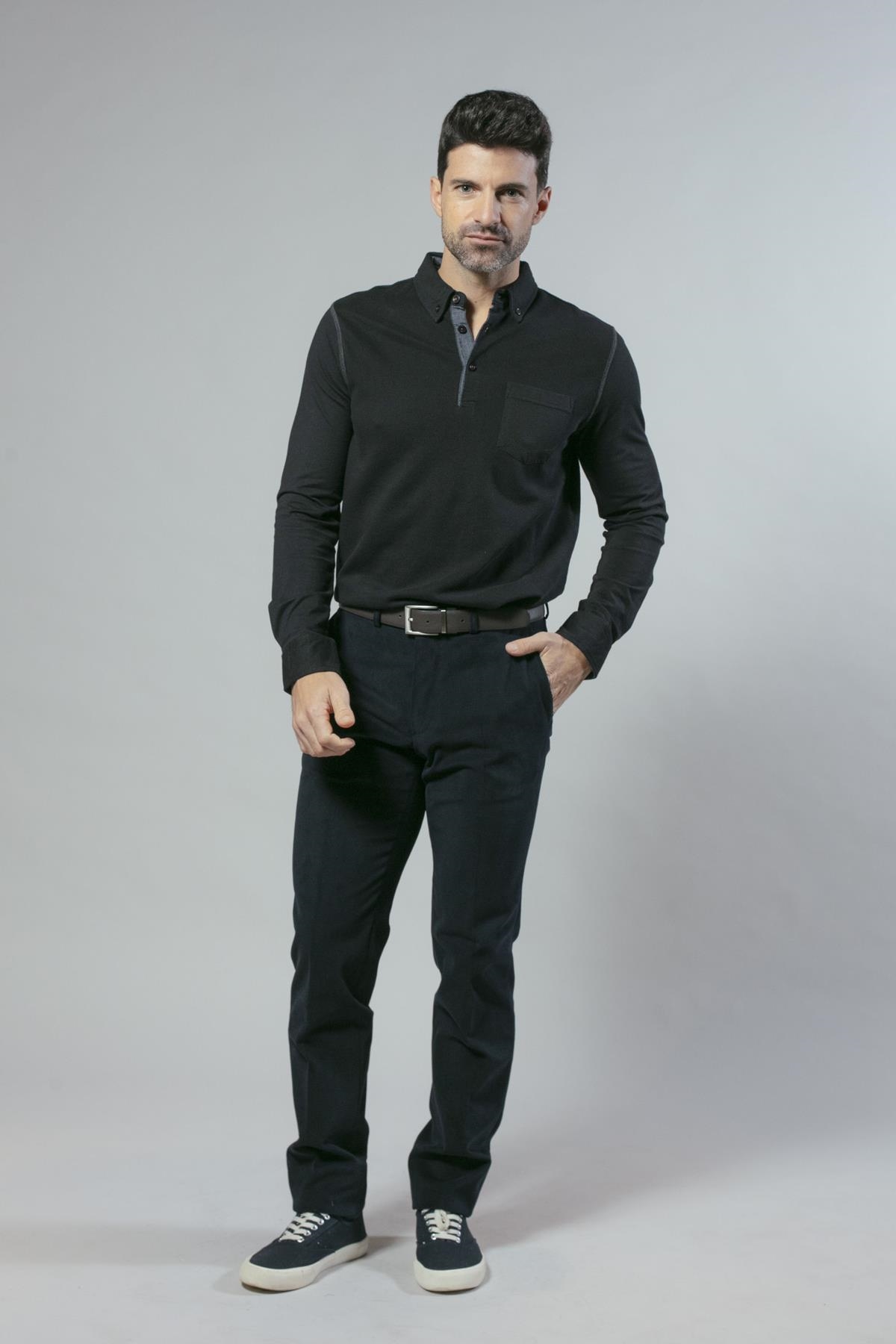 Polo de manga larga con frontal en estructura de algodón. Es de corte regular, con botones en el cuello y un bolsillo. Disponible en dos colores: negro y azul marino.