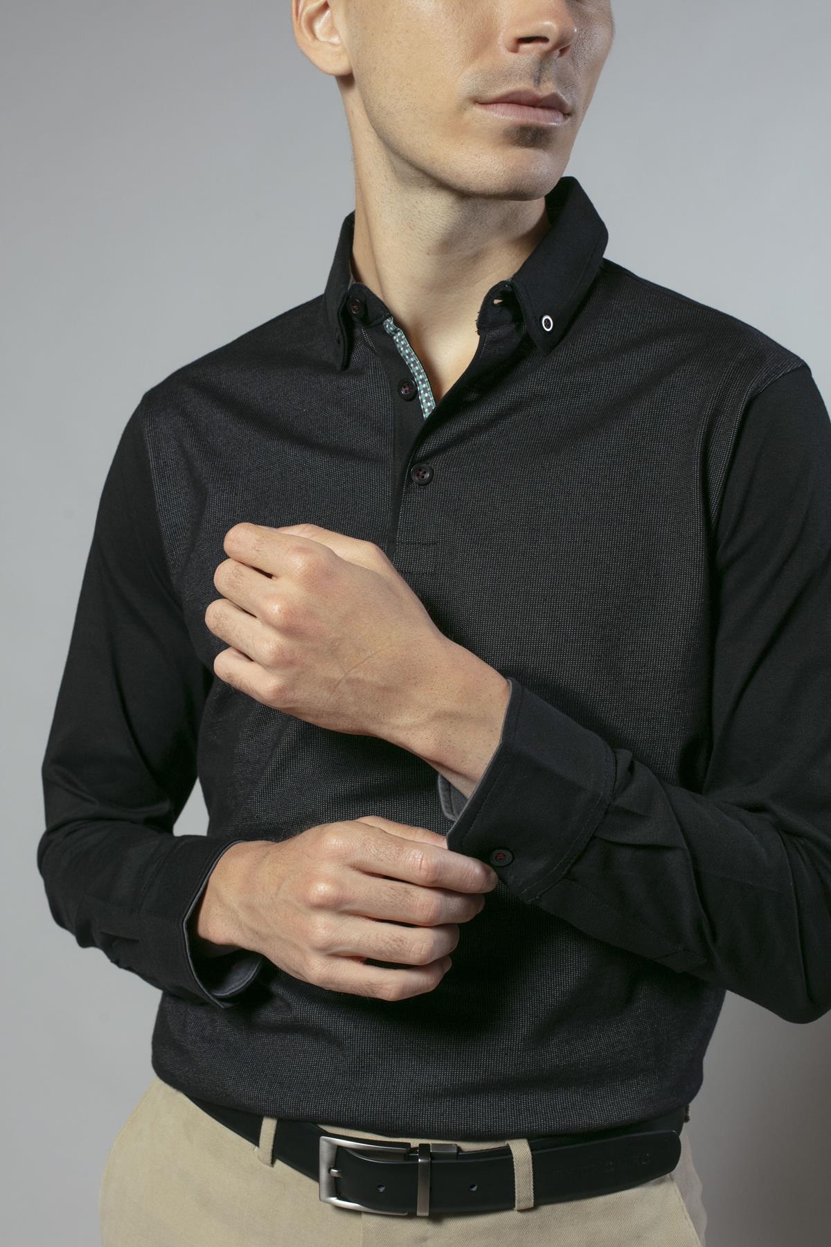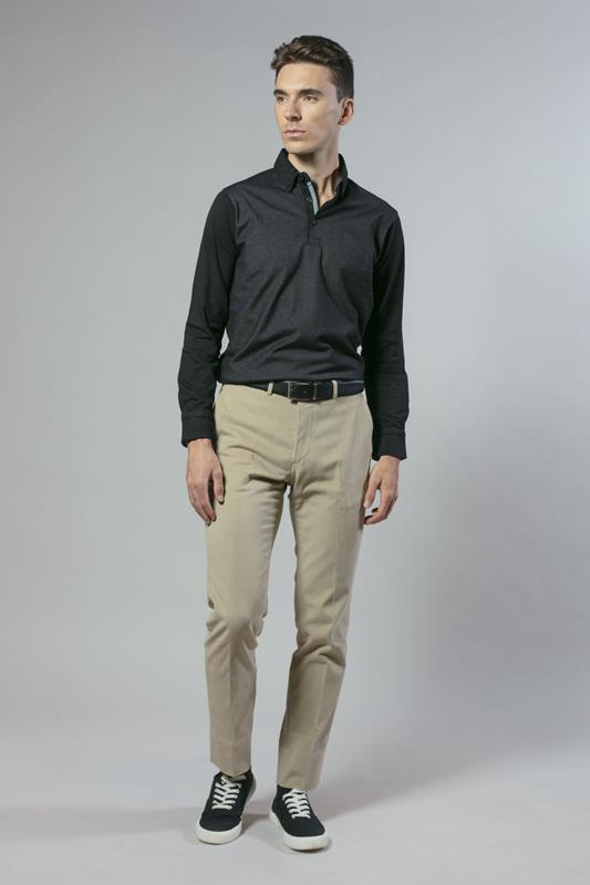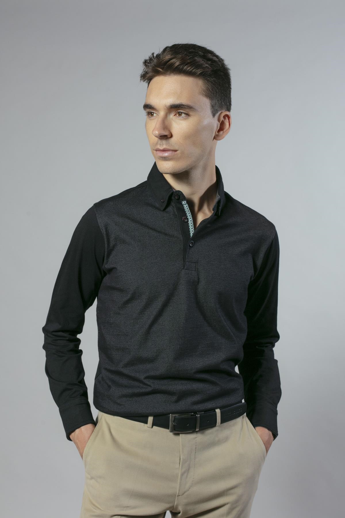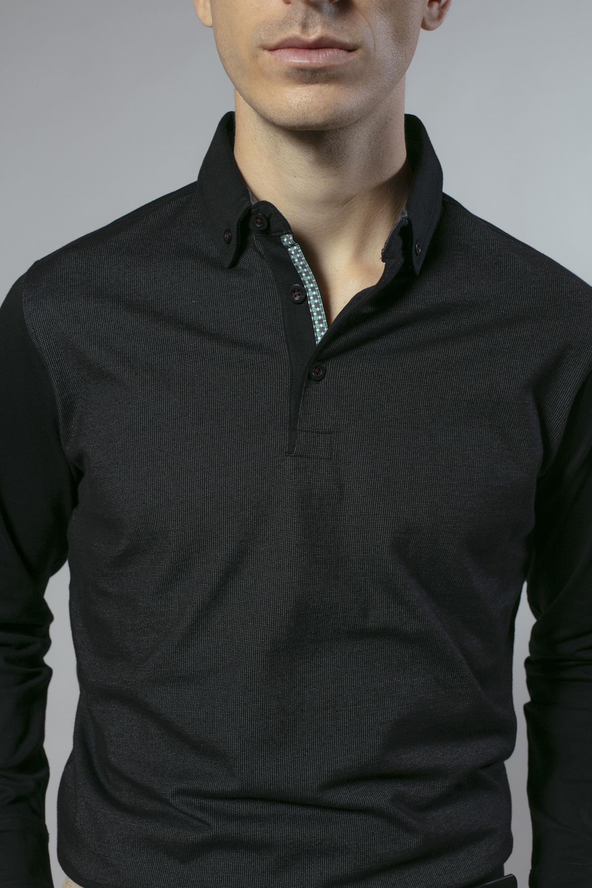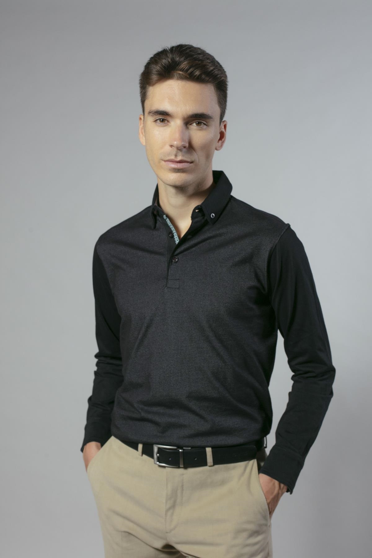 Polo de manga larga con frontal en jacquard de algodón de corte regular. Disponible en dos colores: negro y granate.