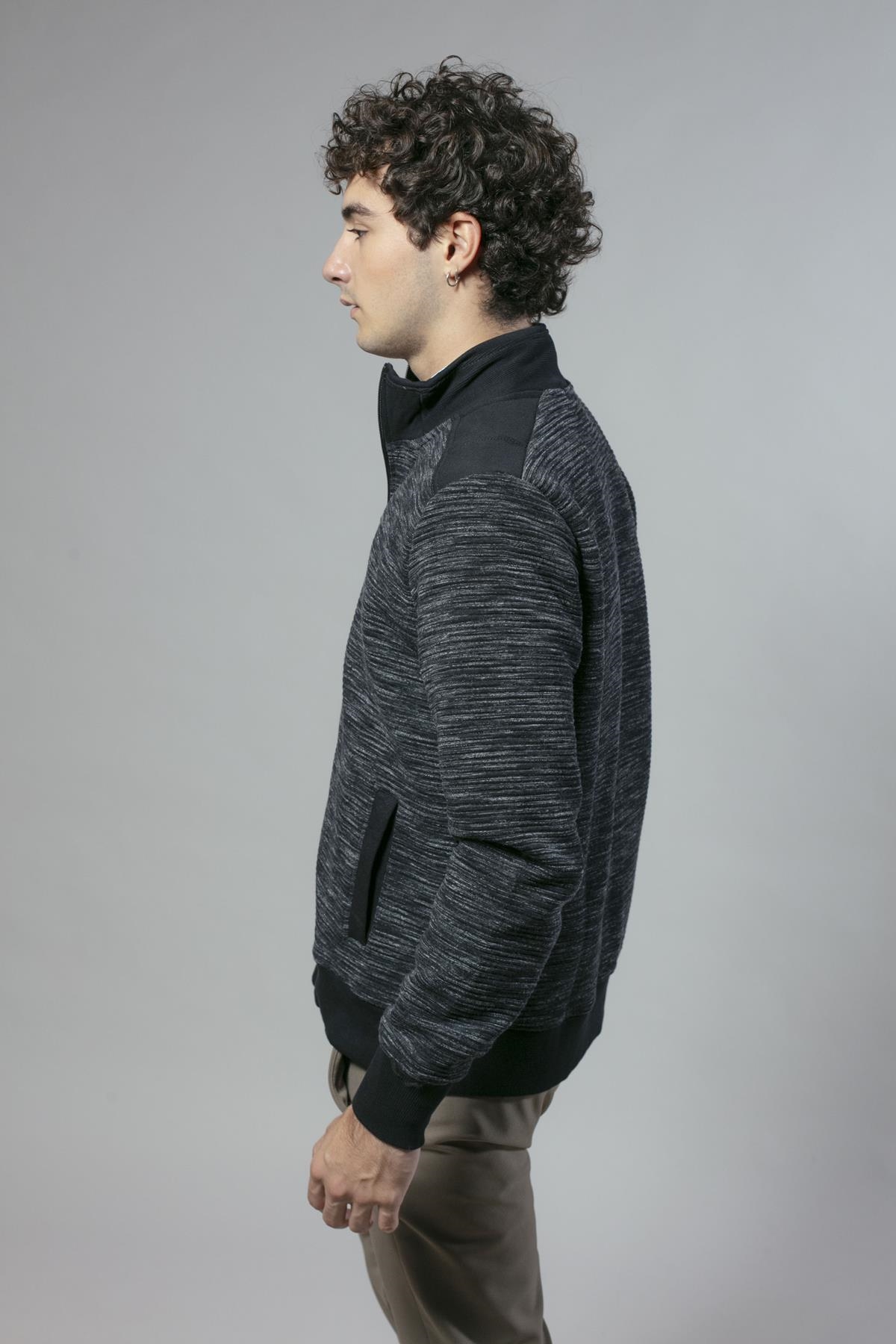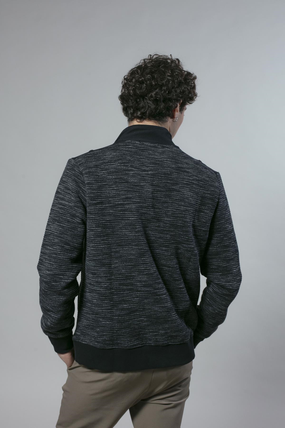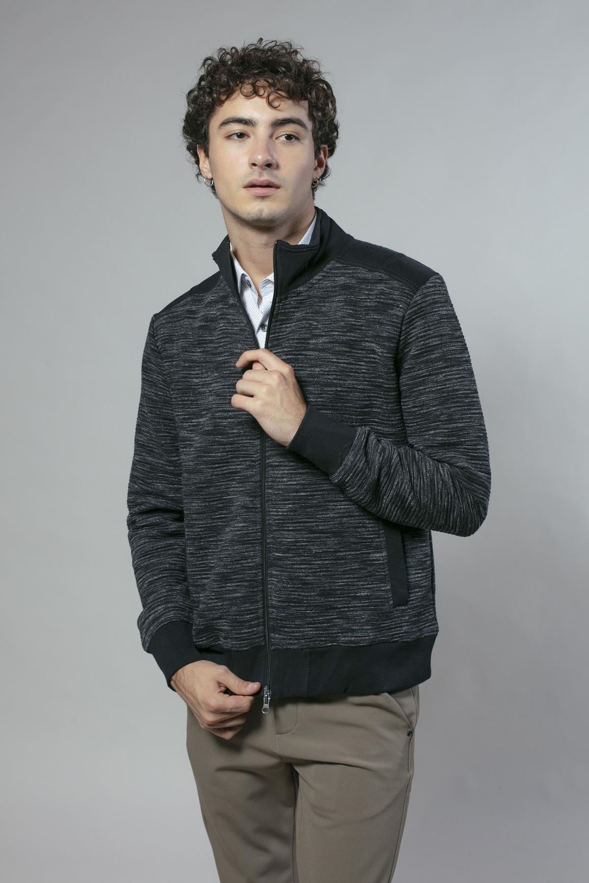 Chaqueta negra de rayas horizontales en estructura de algodón elástico. De corte regular, cierre de cremallera y bolsillos laterales.