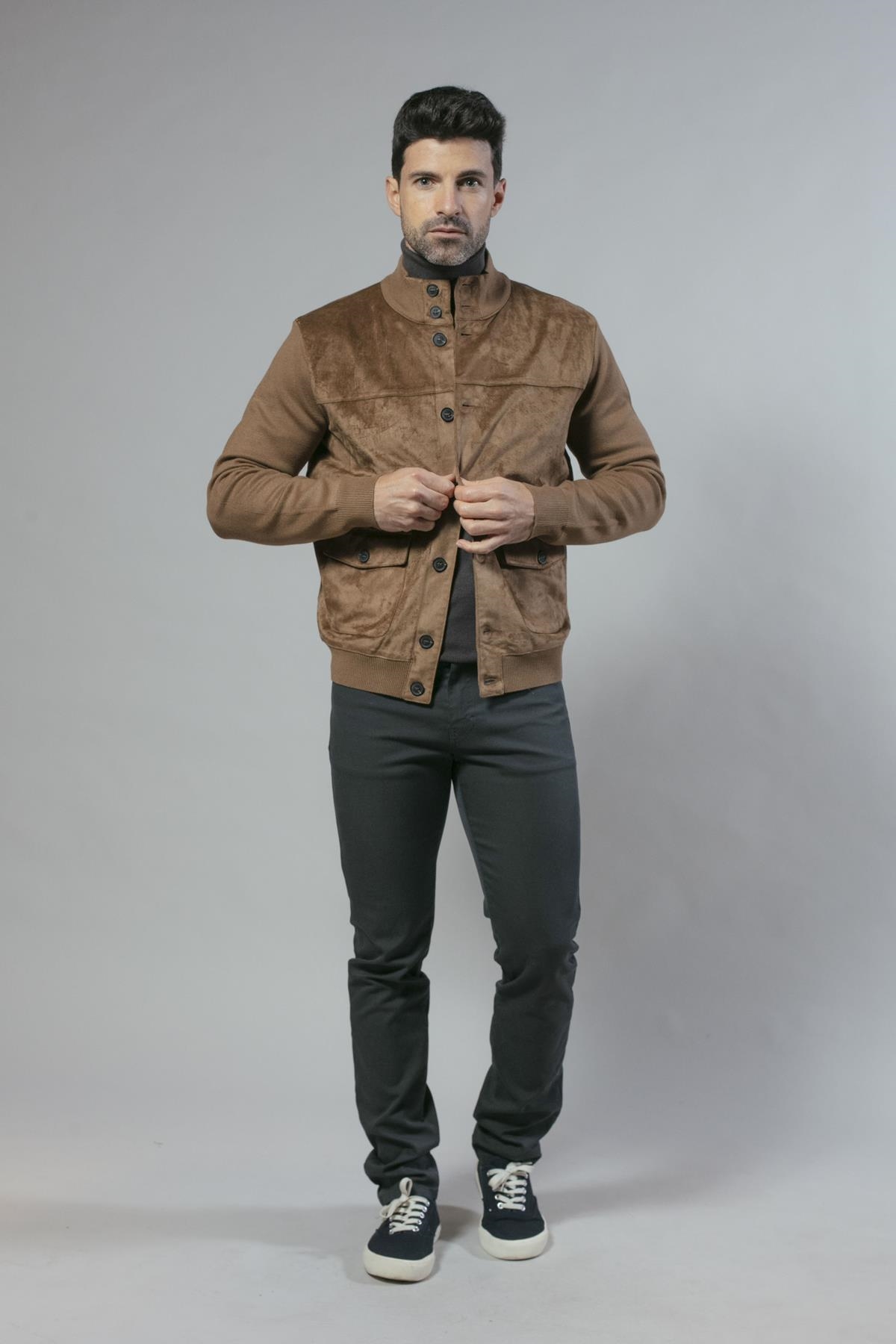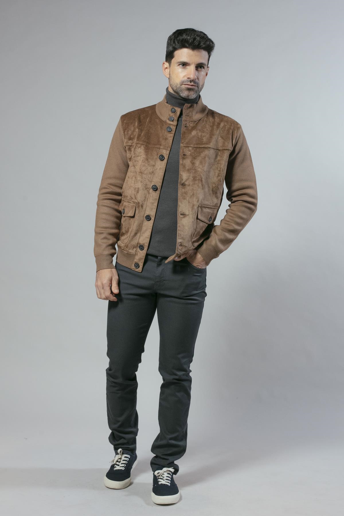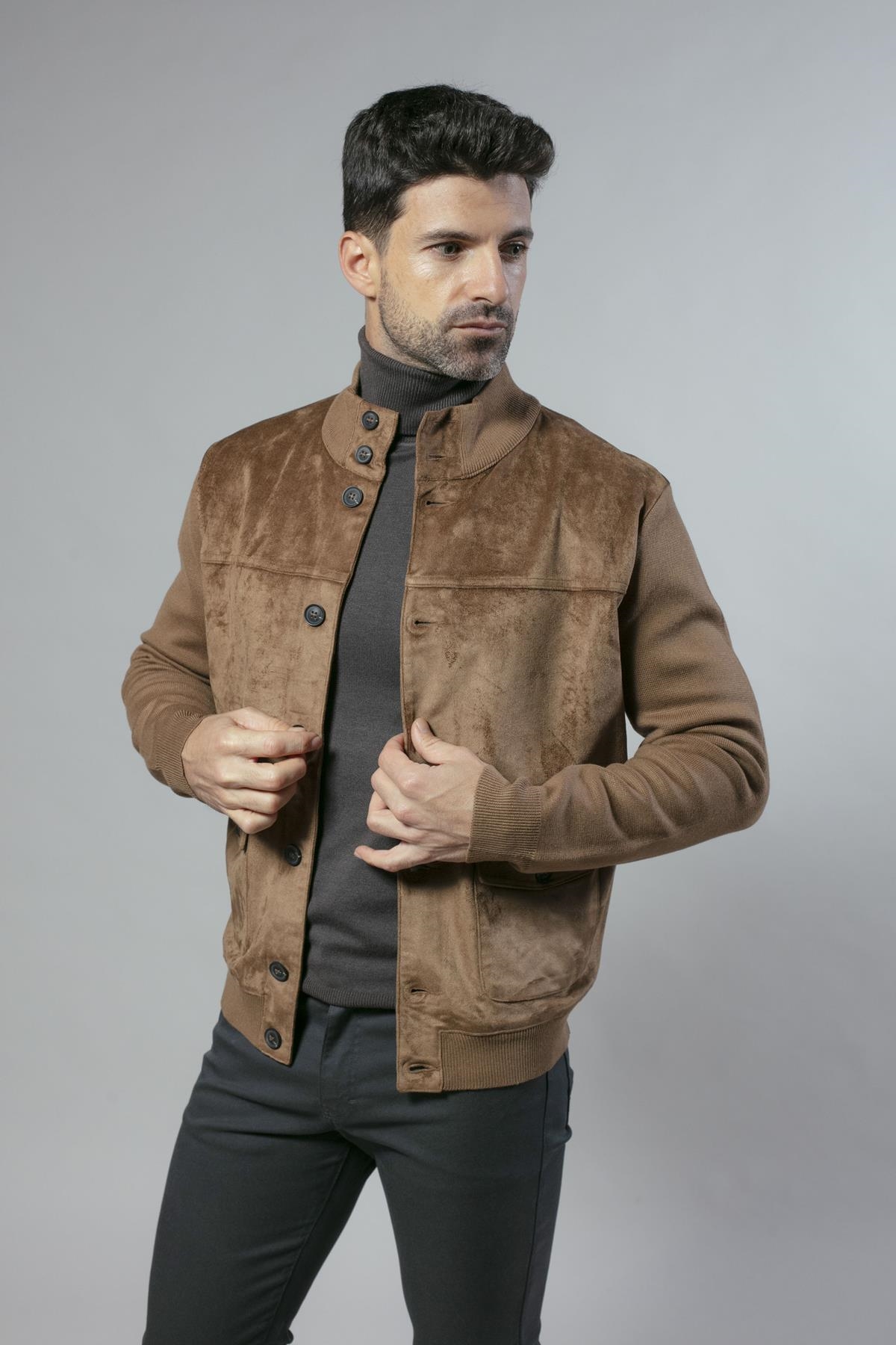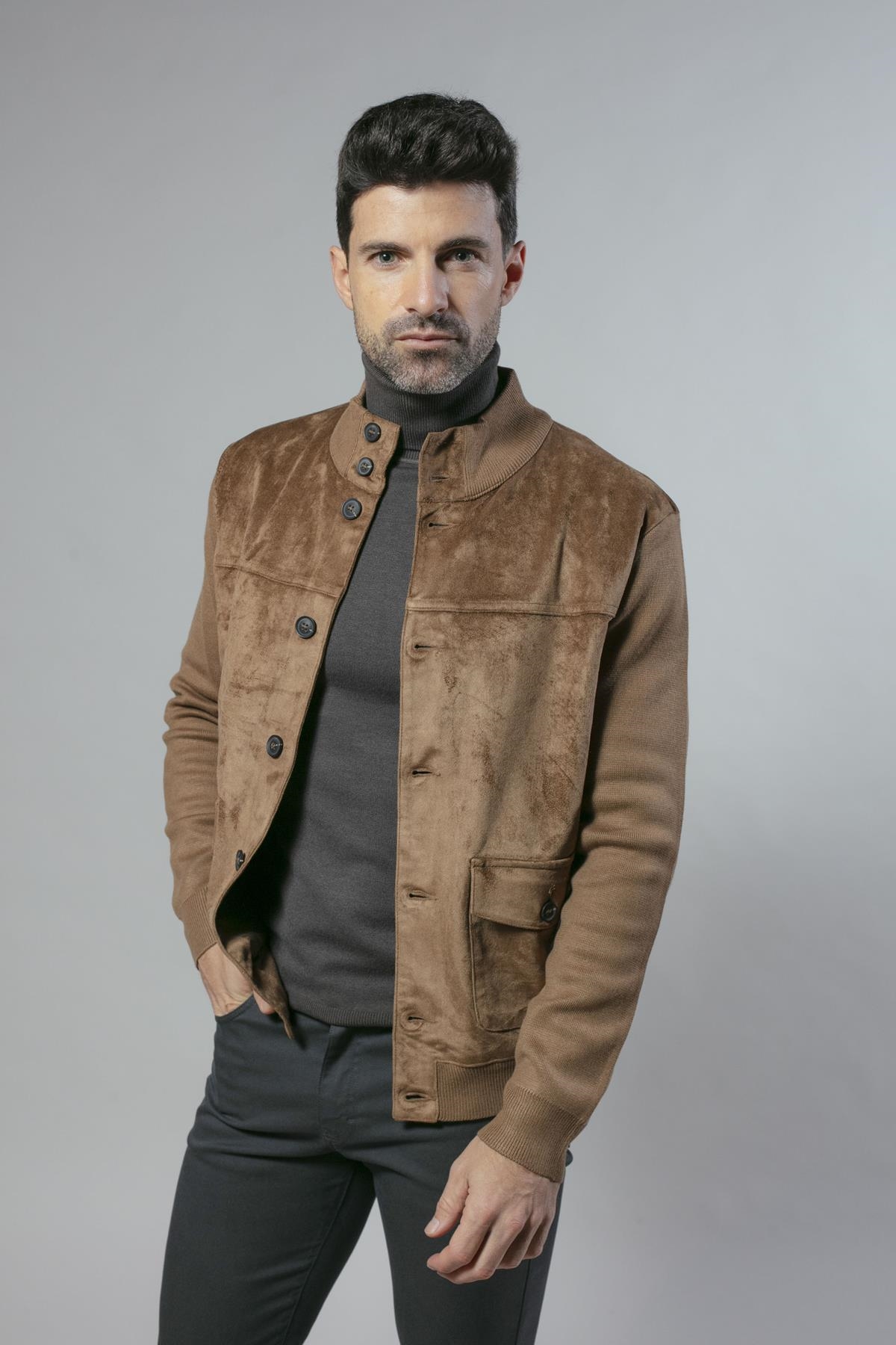 Chaqueta camel en lana con frontal de antelina. De corte ligeramente regular, tiene el cuello y los puños en canalé, cierre de botones y dos bolsillos.