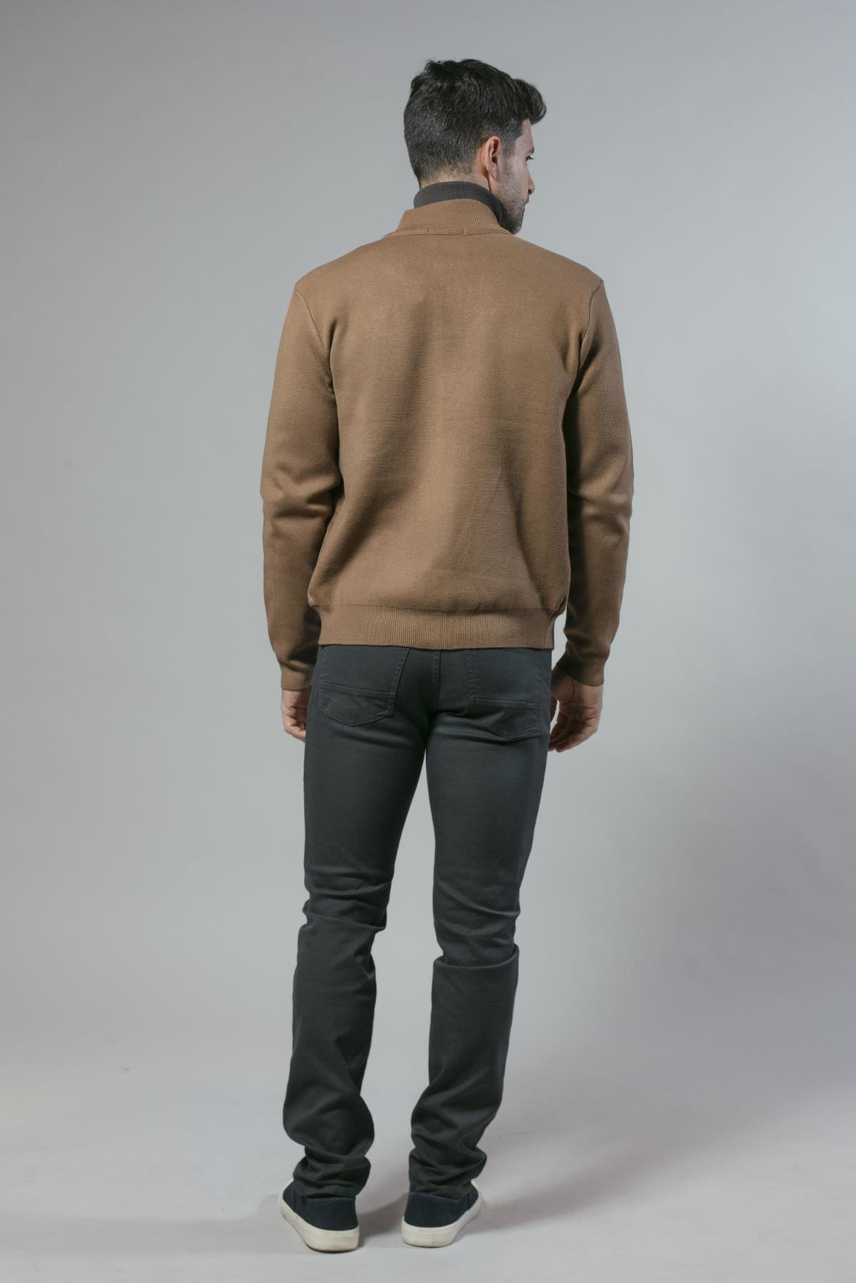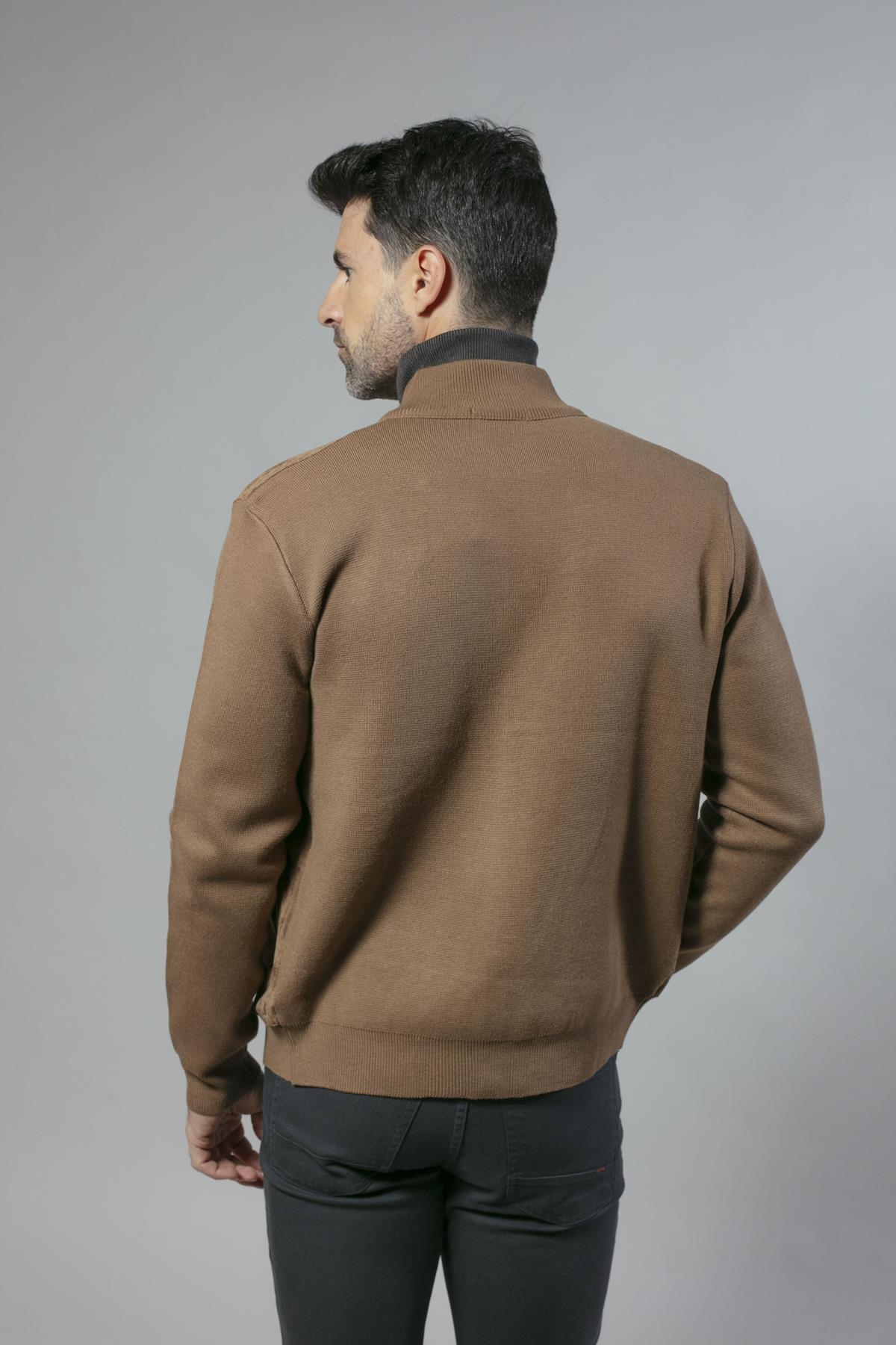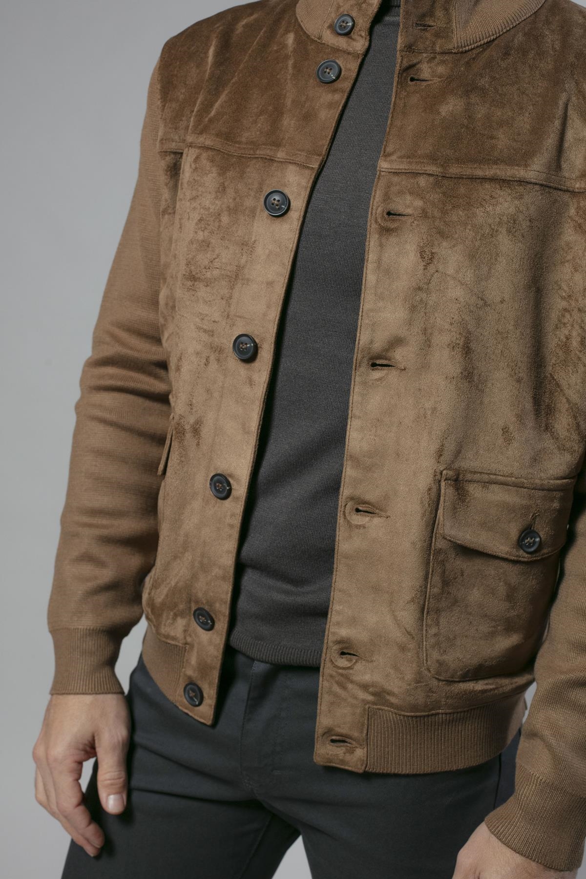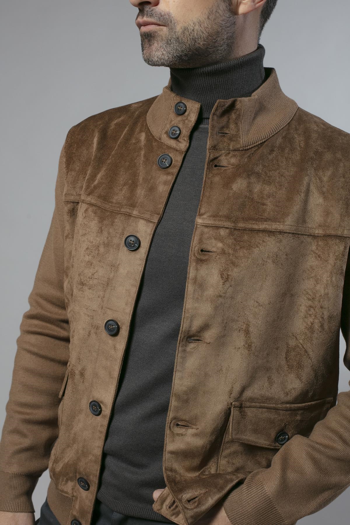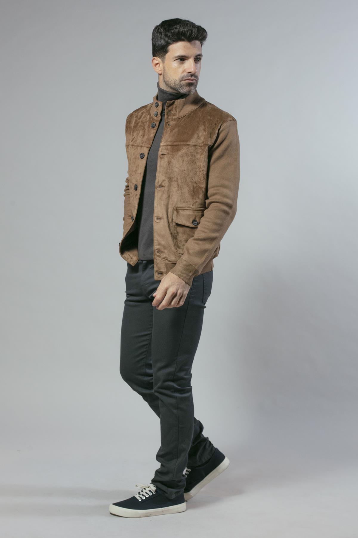 Chaqueta camel en lana con frontal de antelina. De corte ligeramente regular, tiene el cuello y los puños en canalé, cierre de botones y dos bolsillos.