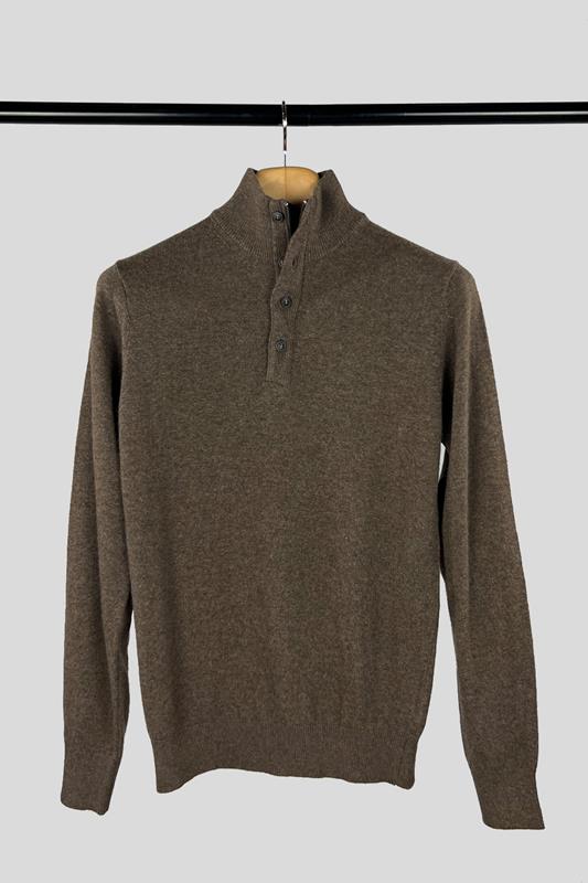 Jersey marrón en lana, de manga larga y cuello alto con cremallera y botones. Corte entallado.