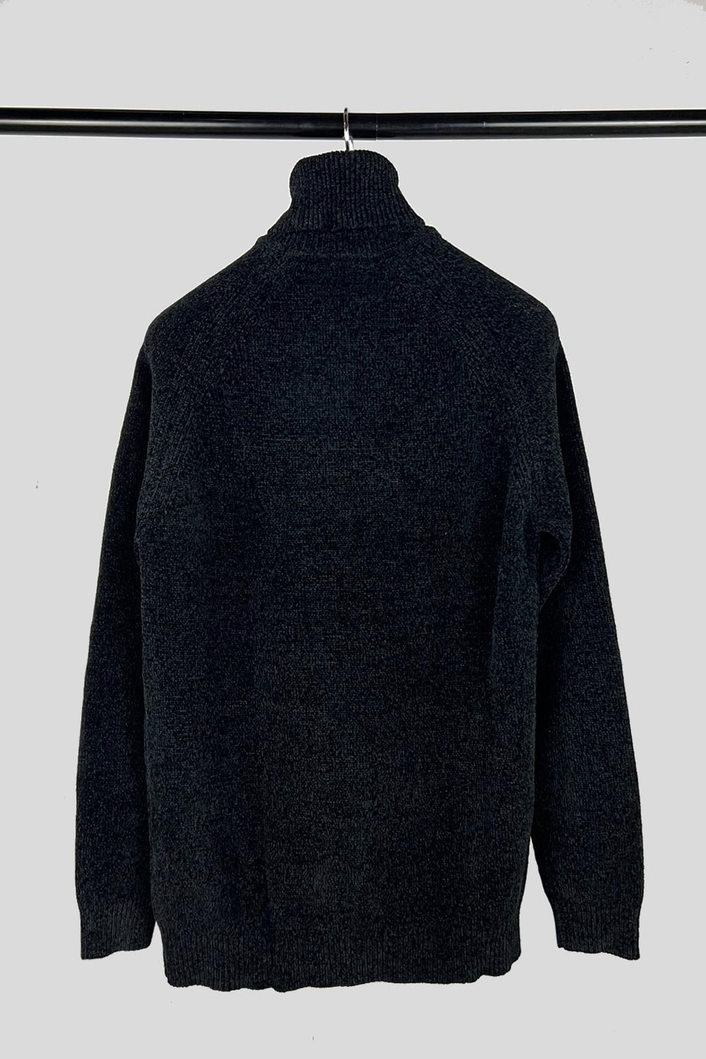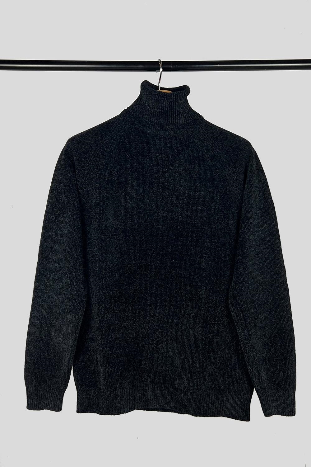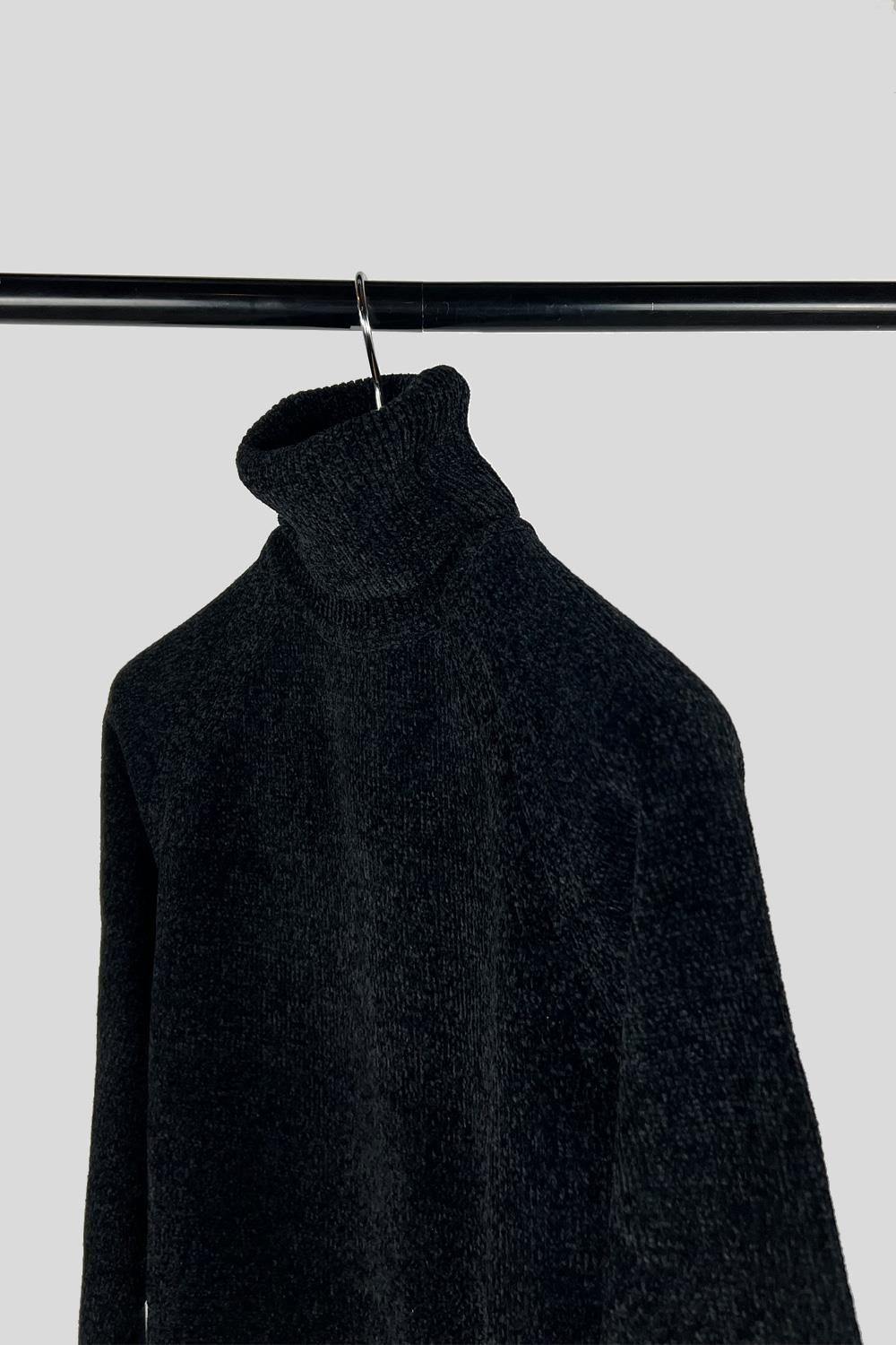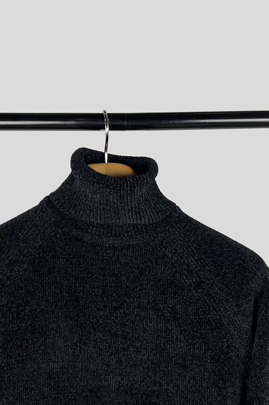 Jersey entallado en chenilla, de manga larga y cuello alto. Disponible en negro y gris jaspado.