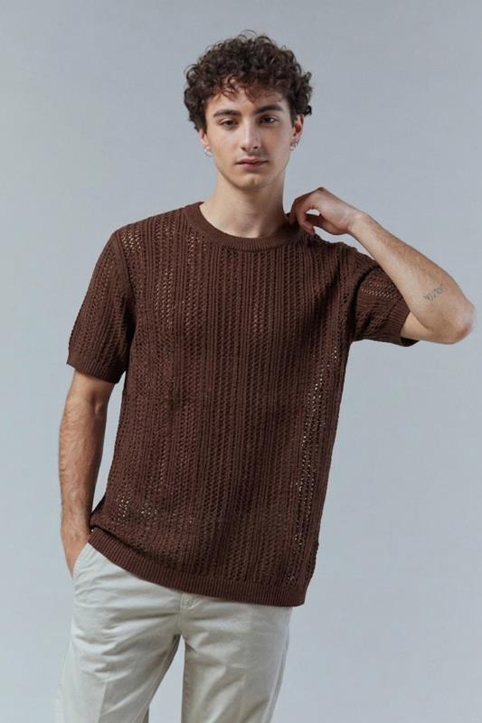 Jersey marrón en algodón perforado, de manga corta y cuello redondo con mangas y bajo en canalé. Por su composición y corte regular puede llevarse con una camiseta debajo.
