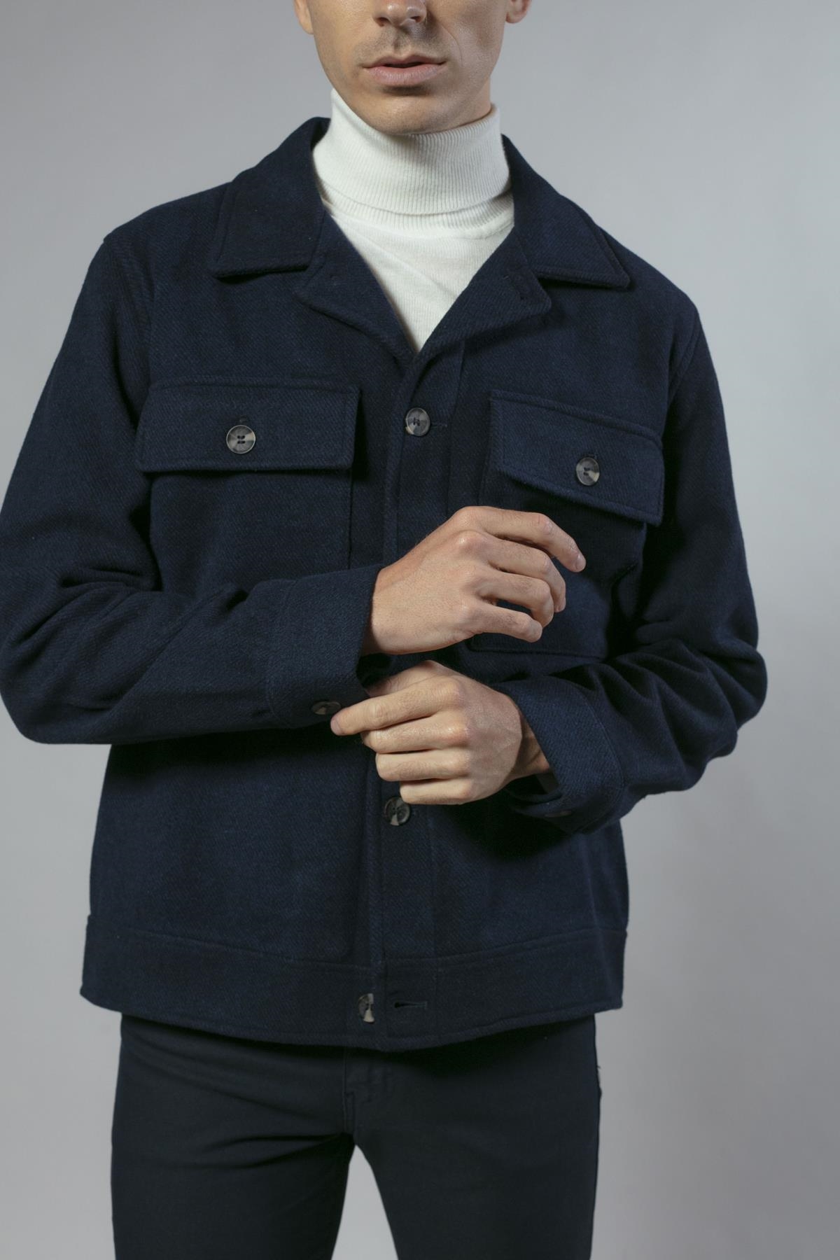 Sobrecamisa corta en lana, de corte regular, con bolsillos frontales y cierre de botones. Disponible en dos colores: azul marino y marrón.