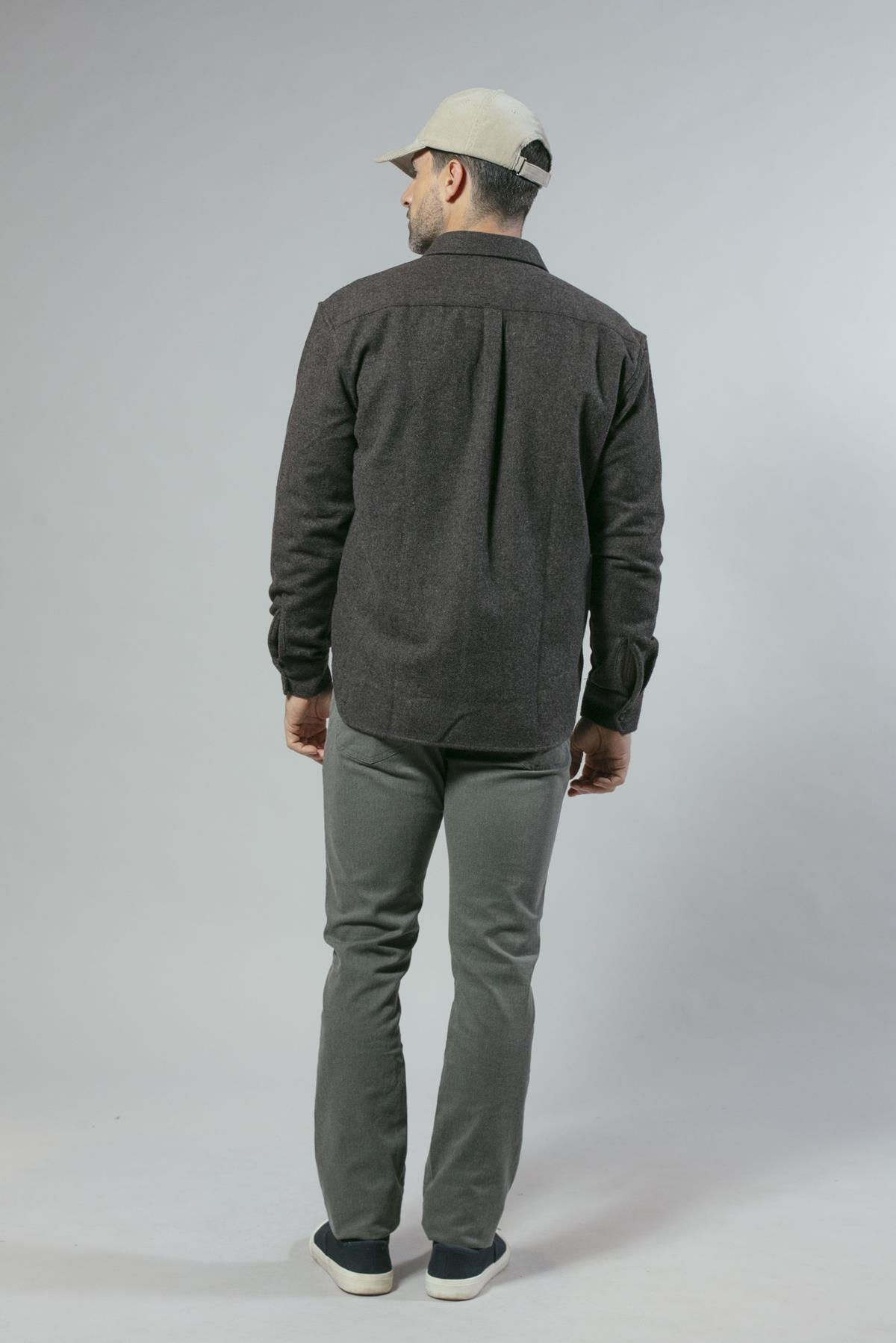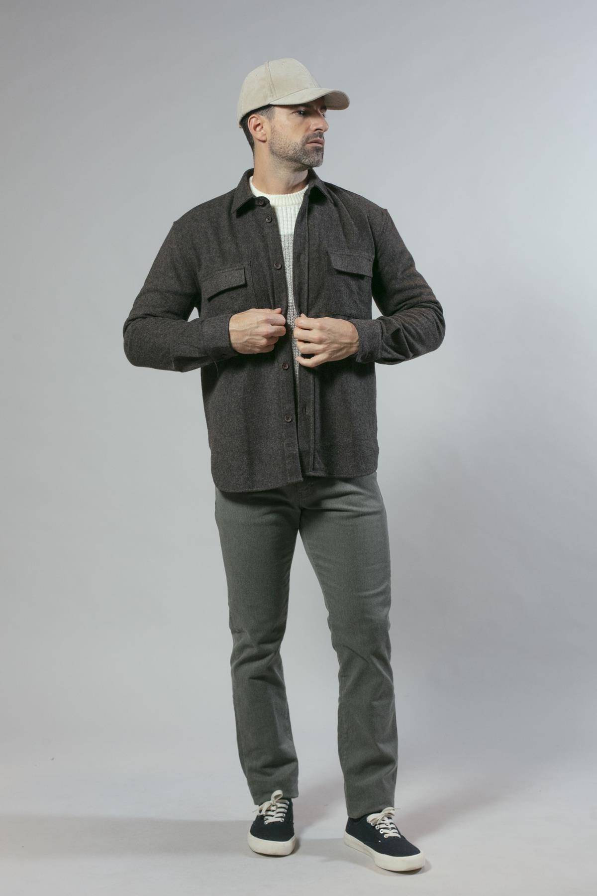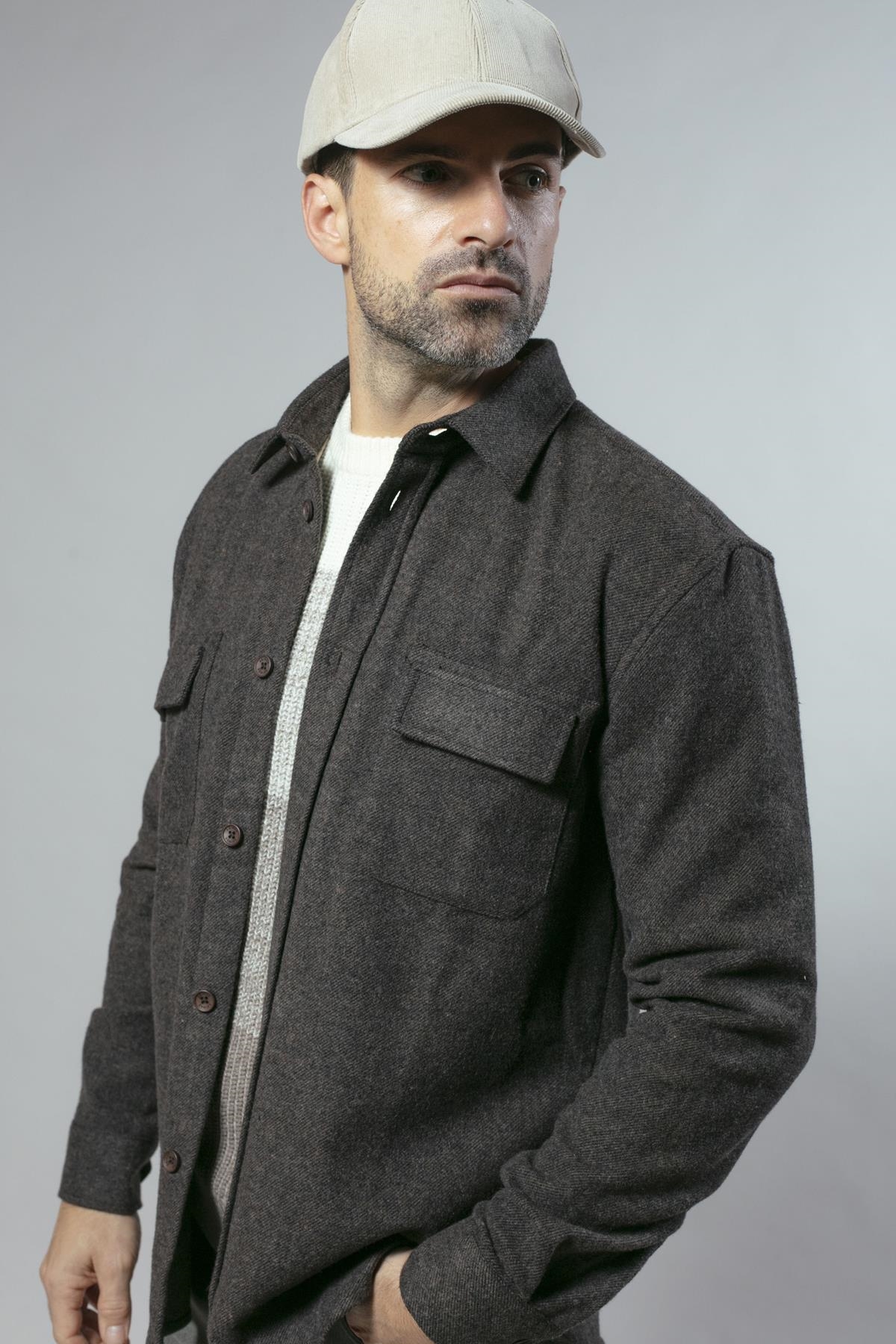 Sobrecamisa marrón en franela, de corte regular y con dos bolsillos frontales.