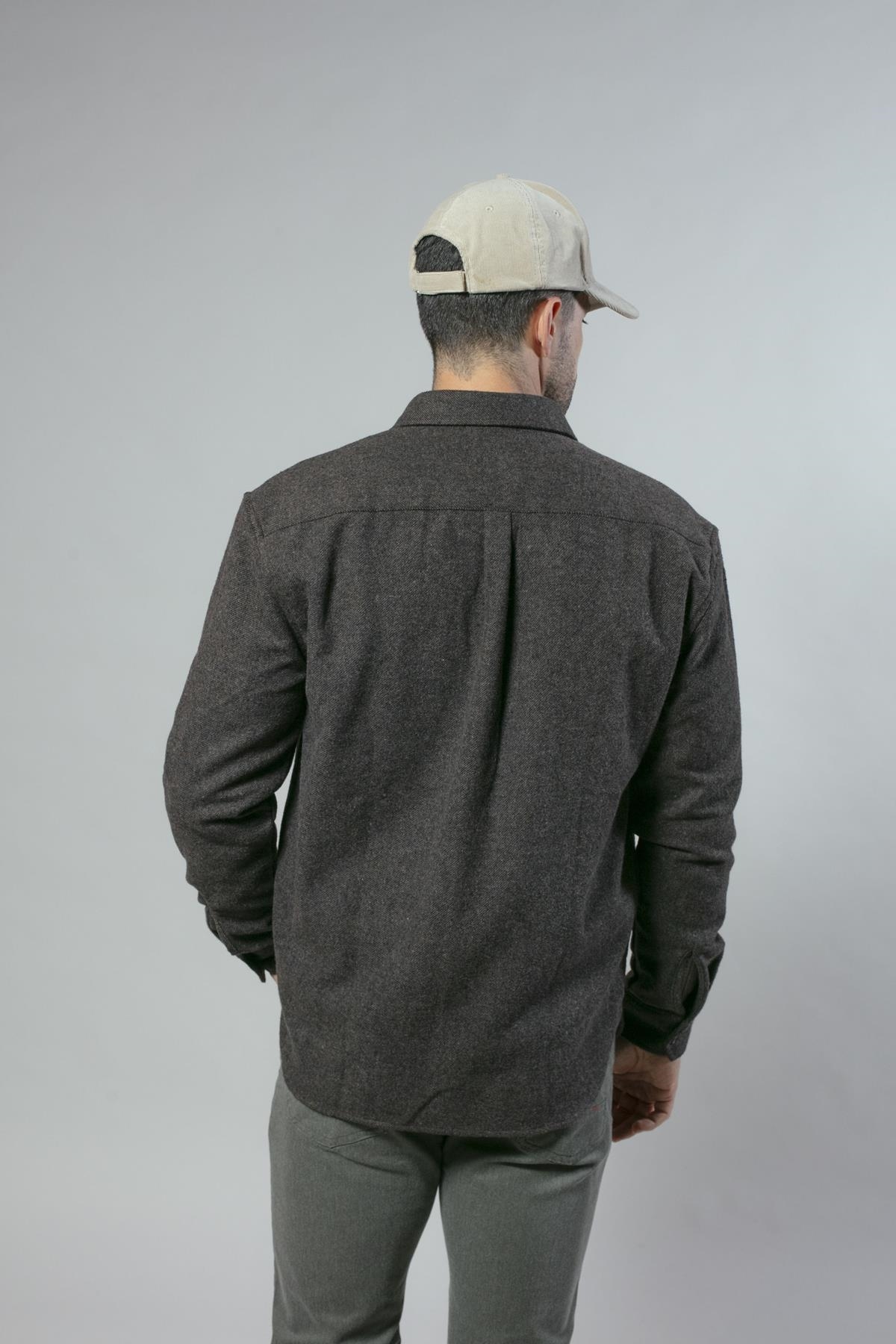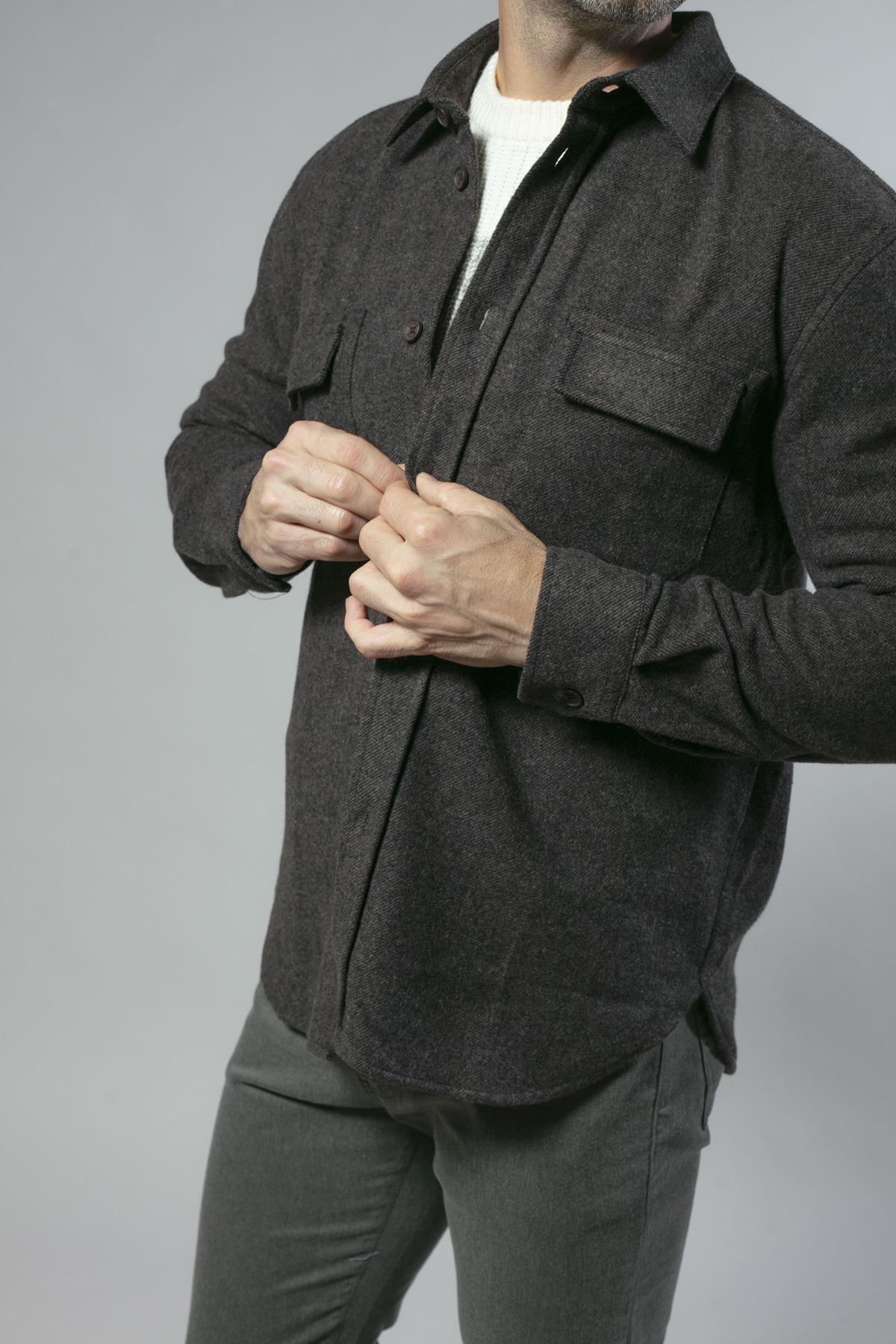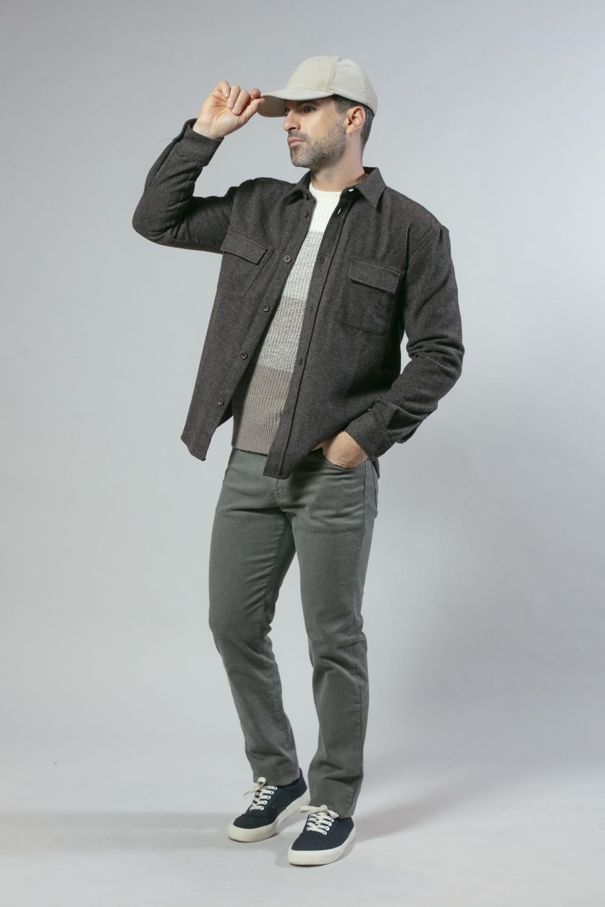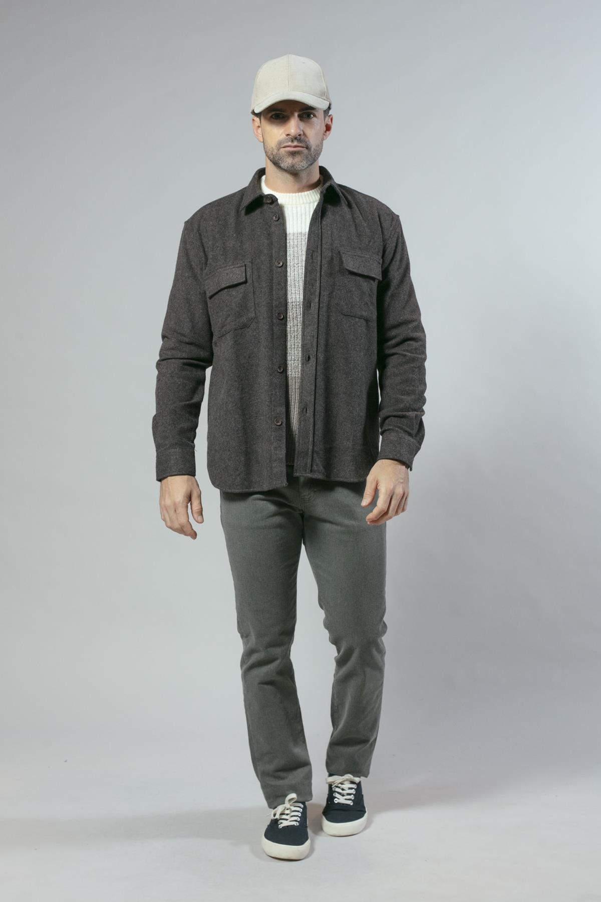 Sobrecamisa marrón en franela, de corte regular y con dos bolsillos frontales.