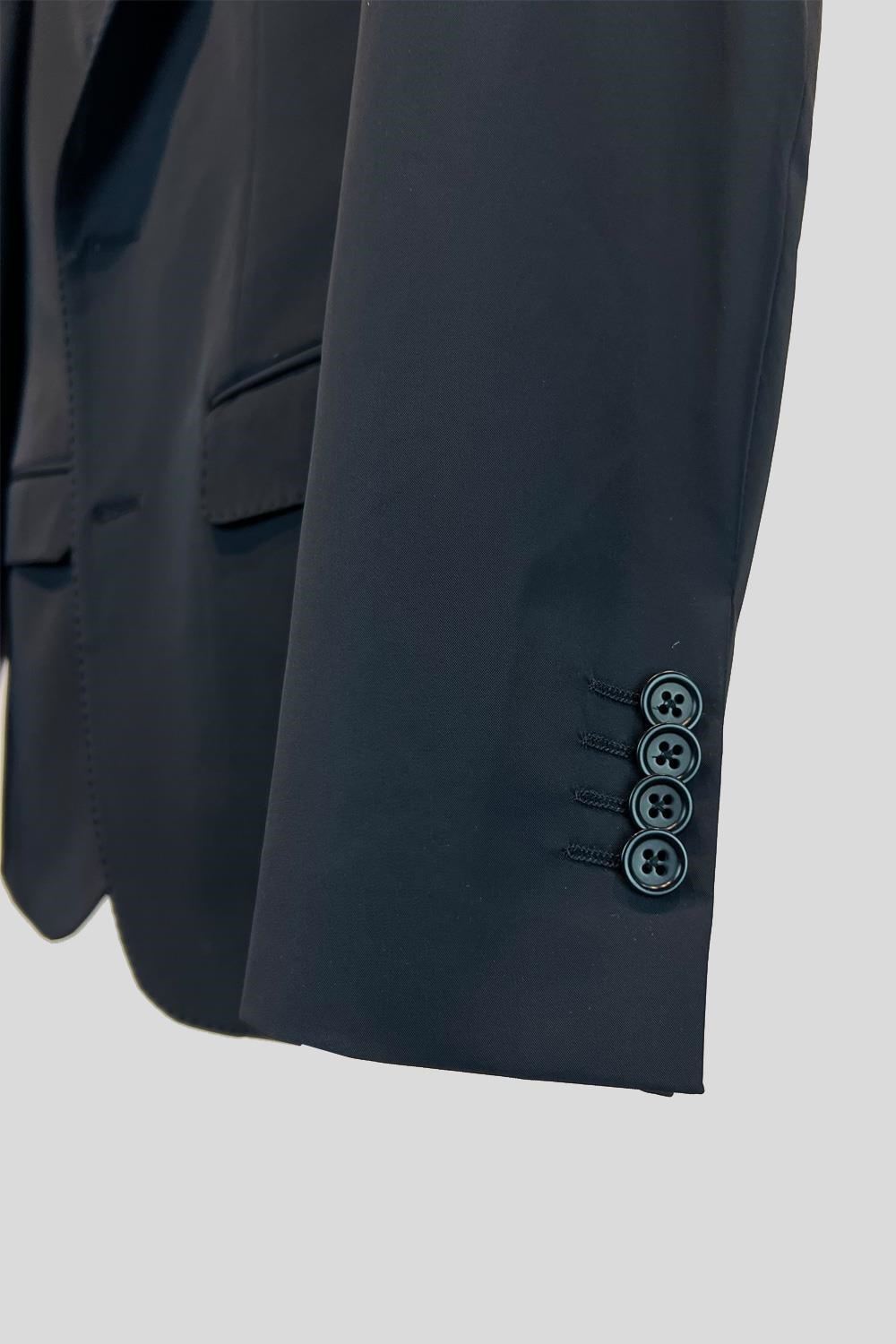 Traje de chaqueta de corte entallado en nylon disponible en azul marino y verde tostado. El ancho de la solapa de la americana es de 8 cm y el bajo del pantalón 18 cm.